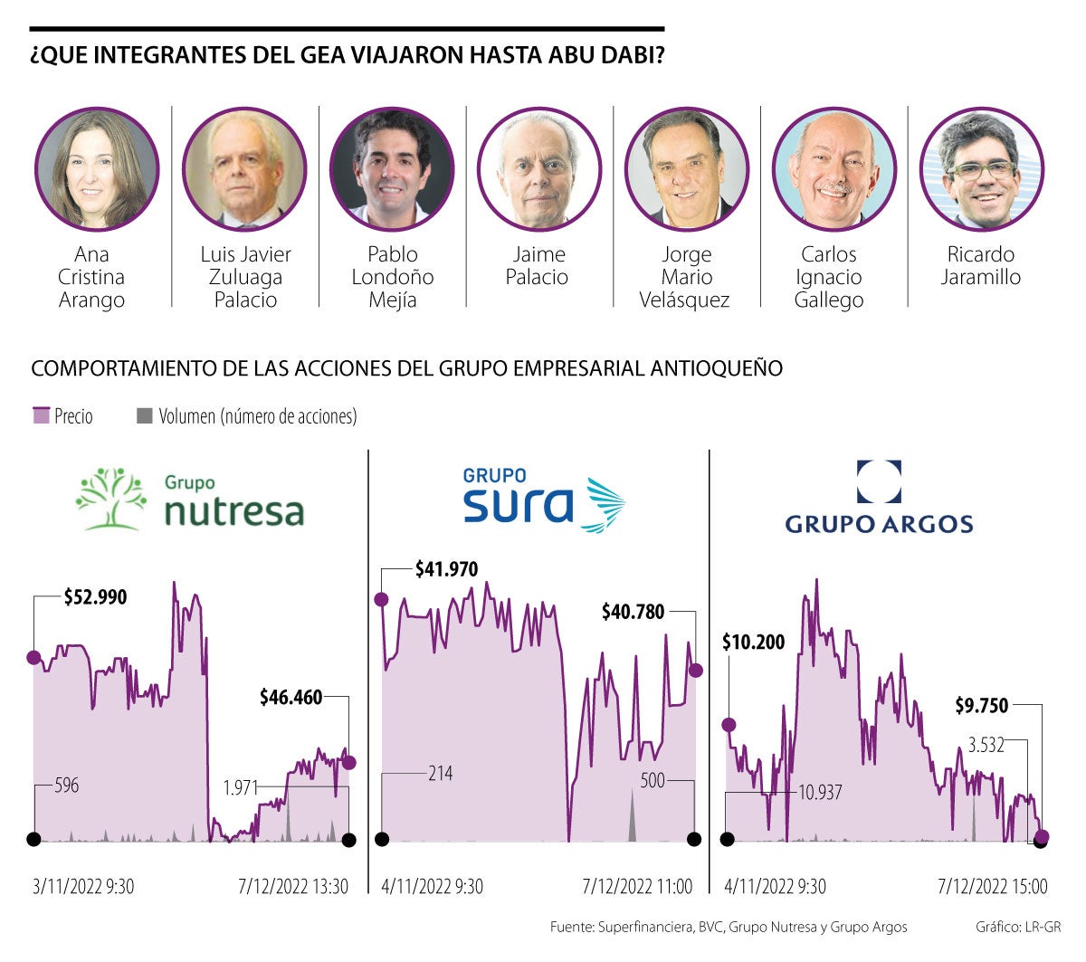 La comitiva estuvo integrada por Carlos Ignacio Gallego, presidente del Grupo Nutresa; Jorge Mario Velásquez, presiente del Grupo Argos; Juan Pablo Londoño, presidente de Alkosto y sobrino de Santiago Mejía (cabeza del GEA); Ana Cristina Arango, hija de Adolfo Arango (miembro de la familia Arango, accionista de Argos); Luis Javier Zuluaga Palacio, quien renunció a la Junta de Nutresa y es proveedor de Nutresa; Jaime Palacio, presidente de la Junta de Nutresa y representante de dicha familia que tiene 7%; y Ricardo Jaramillo, gerente financiero de Sura.p