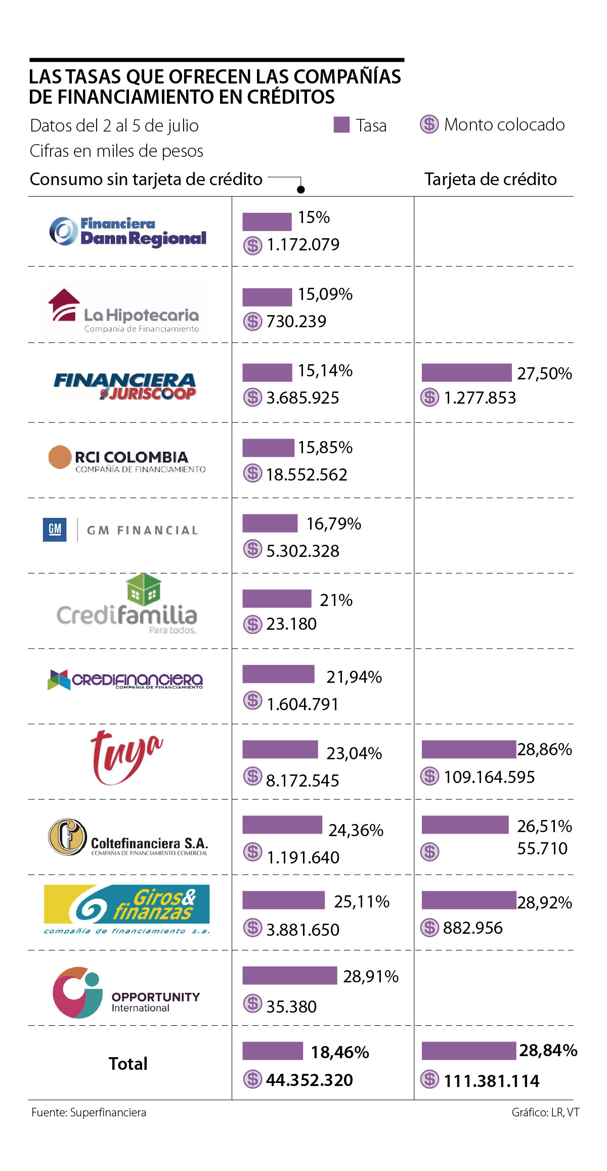 En la primera semana del séptimo mes del año, las compañías de financiamiento movieron $44.352,32 millones en créditos de consumo. La extranjera RCI Colombia, que prestó a 15,85%, registró el mayor monto al llegar a $18.552,56 millones; mientras que en segunda posición se ubicó Tuya, que movió $8.172,55 millones y prestó a una tasa de 23,04%.