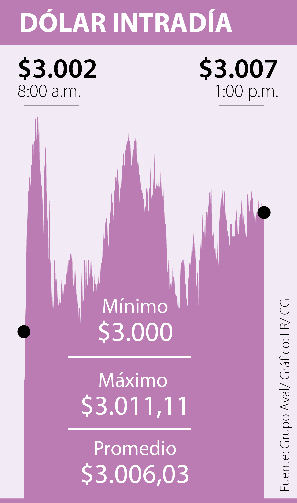 La divisa abrió la jornada con un precio de $3.002 y su cierre fue de $3.007. El valor mínimo que se registró en la plataforma Set-Fx fue de $3.000, mientras que el máximo fue $3.011,11.