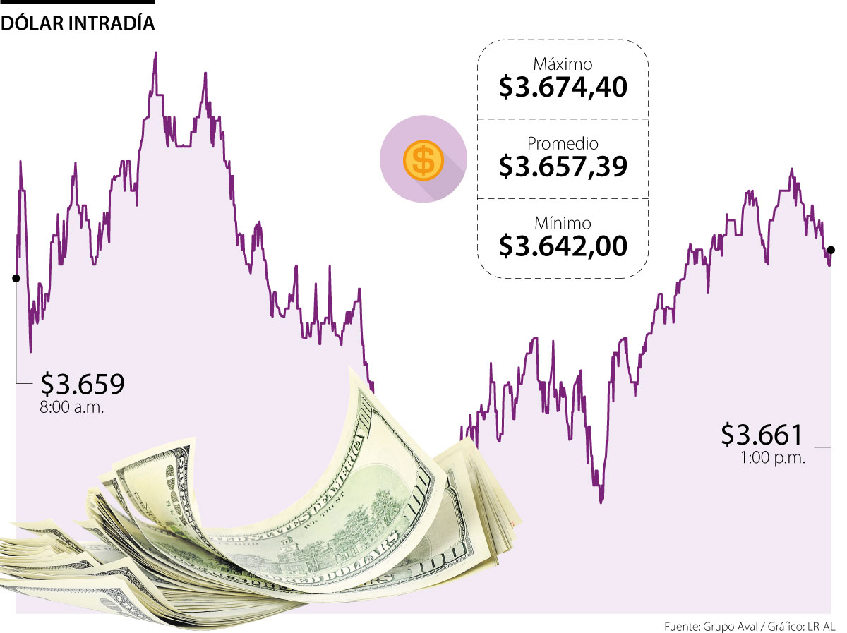 Ayer, el dólar cerró en un precio promedio de $3.657,39, lo que representó un aumento de $15,1 frente a la Tasa Representativa del Mercado (TRM), que para la jornada se ubicó en $3.642,29.