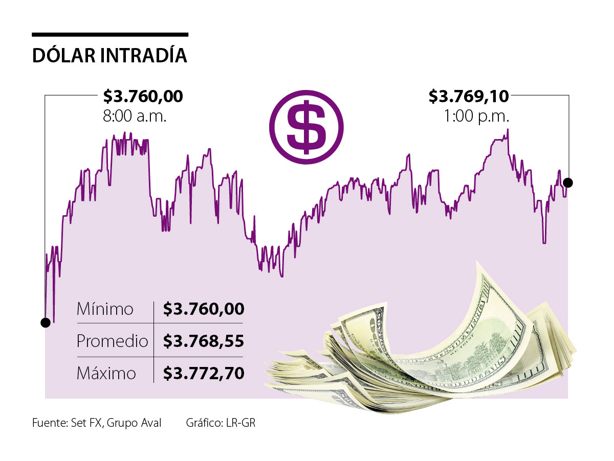 El lunes, el dólar alcanzó un precio promedio de $3.768,55, lo que representó un alza de $35,47 frente a la tasa representativa del mercado, que se ubicó en $3.733,08.