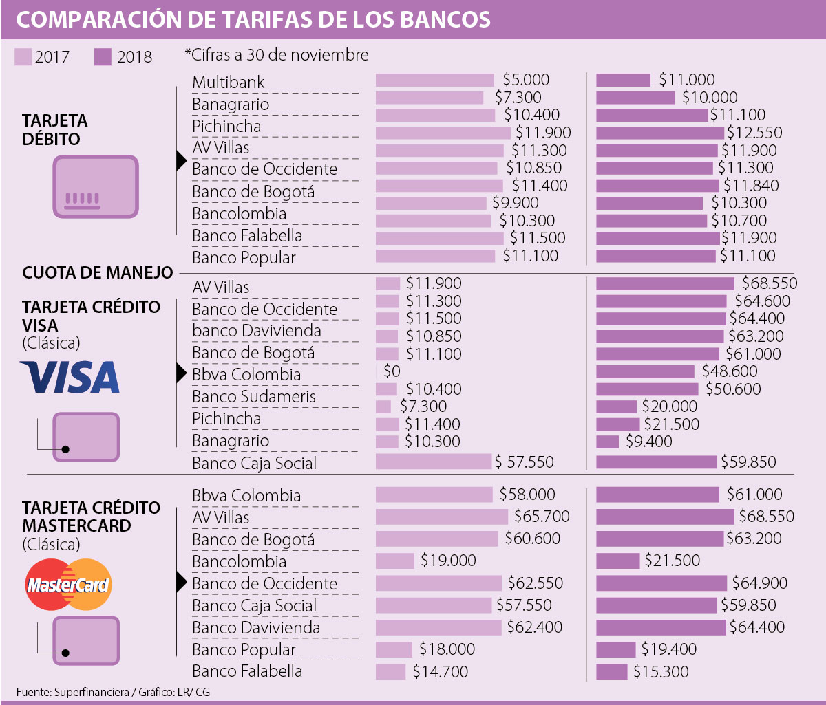 En la lista de tarifas, LR le da a conocer los bancos que más han aumentado sus costos en un año, específicamente en productos como cuotas de manejo de tarjetas de crédito, transferencias a otras entidades hechas por internet e incluso el manejo de la tarjeta débito.