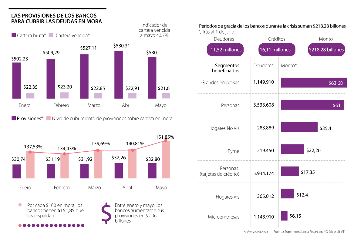 Todo lo anterior se demuestra con las siguientes cifras: en enero, los bancos que operan en el país iniciaron el año con $30,74 billones de provisiones, con un índice de cobertura de 137,53% sobre la cartera vencida ($22,35 billones) y en mayo estos recursos ya suman $32,80 billones, es decir aumentaron en $2,06 billones. Desde marzo, mes en el que inició la crisis, esas provisiones aumentaron en $880.000 millones y, solo en mayo, en $540.000 millones.