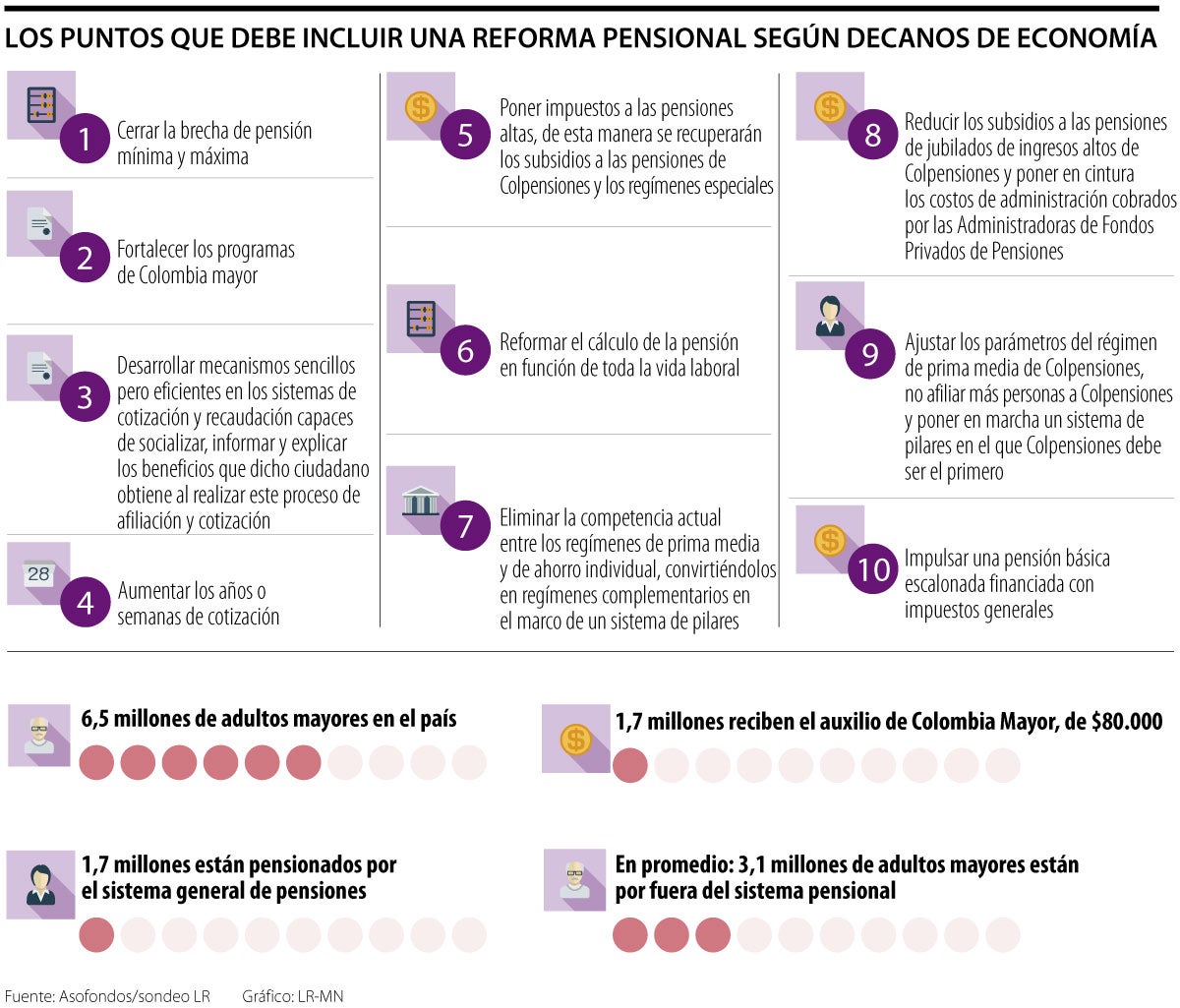 En lo que se refiere al sistema pensional, y si se analizan los datos de la Asociación Colombiana de Administradoras de Fondos de Pensiones y de Cesantía (Asofondos), actualmente en el país hay 6,5 millones de adultos mayores, de los cuales 1,7 millones están pensionados por el sistema general de pensiones y 1,7 millones reciben el auxilio de Colombia Mayor, lo que muestra que por lo menos 3,1 millones de adultos mayores están por fuera del sistema.