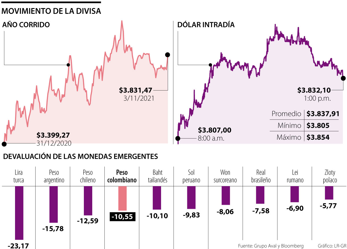 En lo que va del año ha crecido $405,41, mientras que durante el segundo semestre ha repuntado $81,24 y en noviembre ha subido $53,47. Un precio similar no se veía desde el 28 de septiembre, fecha en la que la Tasa Representativa del Mercado (TRM) fue de $3.837,91.