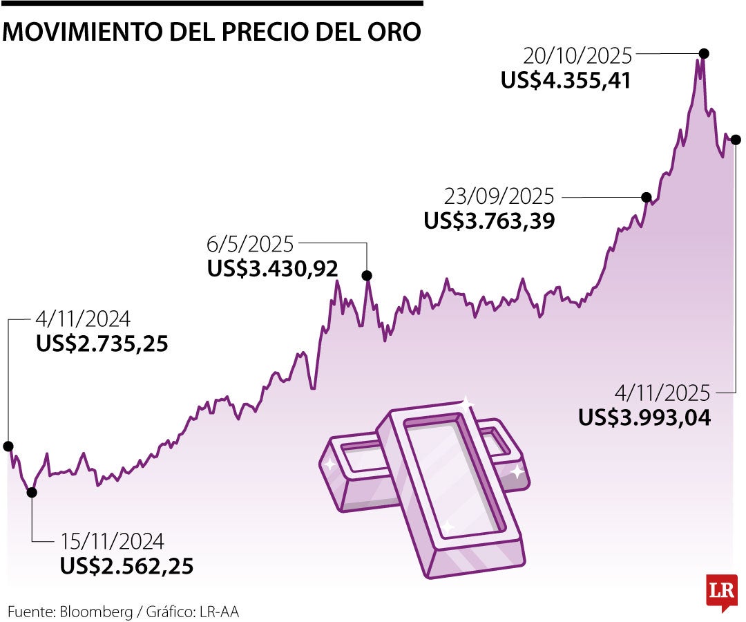 El oro al contado cedió 0,1%, a US$3.996,68 la onza, tras llegar a perder 0,9% en la sesión. El oro en Estados Unidos para entrega en diciembre bajó 0,2%, a US$4.007,7