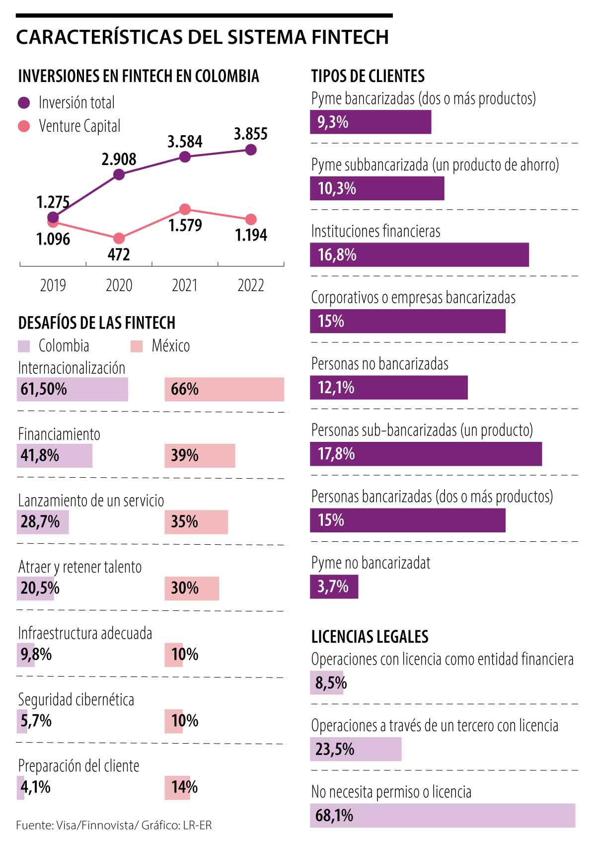 Estas empresas tecnológicas dedicadas a los servicios financieros, a luz del reporte de ese sector realizado por la empresa de innovación y capital riesgo, Finnovista con el apoyo de Visa, dan cuenta que en Colombia ya hay 369 compañías de ese tipo, de hecho crecieron casi 20% desde 2019 en número. Y aunque las inversiones en esos nuevos actores superan los miles de millones de dólares al año, se enfrentan a retos a tal punto que al cierre de 2022, la tasa de mortalidad (es decir, las fintech que tuvieron que cerrar) fue de 17,9%.