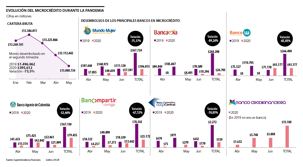 Por ejemplo, el Banco Mundo Mujer, una de las entidades con mayor fortaleza en el segmento de microcrédito, pasó de desembolsar $367.734 millones entre abril y mayo de 2019 a $106.015 millones este año, según el regulador. Este deterioro significó una baja de 71,17% en la entrega de financiación.