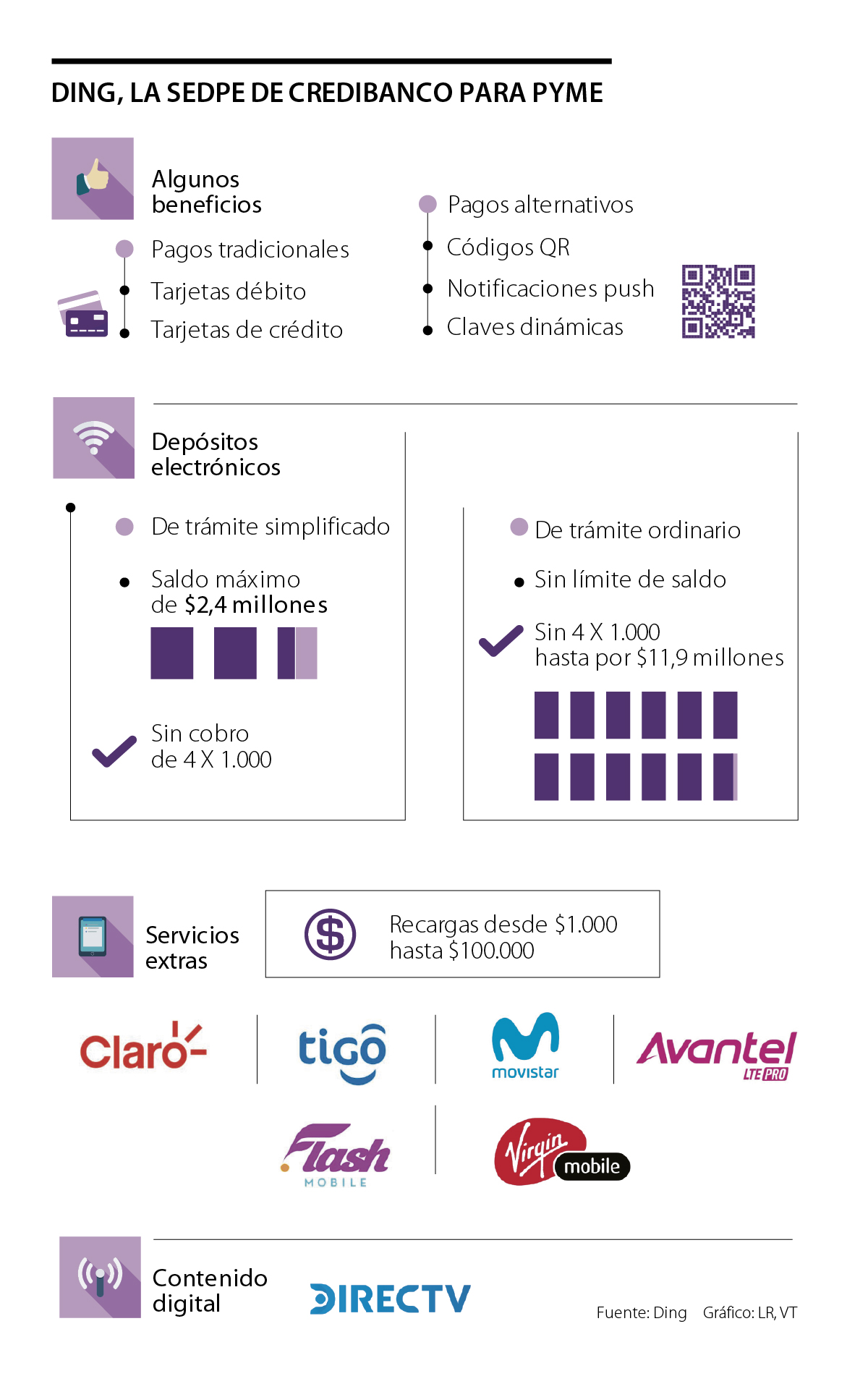 Ding es la nueva Sociedad Especializada en Pagos y Depósitos Electrónicos (Sedpe) creada para que pequeños comerciantes y emprendedores incluyan en sus negocios la opción digital de recibir pagos diferentes al efectivo, como las tarjetas débito y crédito, y formas alternativas, entre códigos QR, claves dinámicas y notificaciones push.