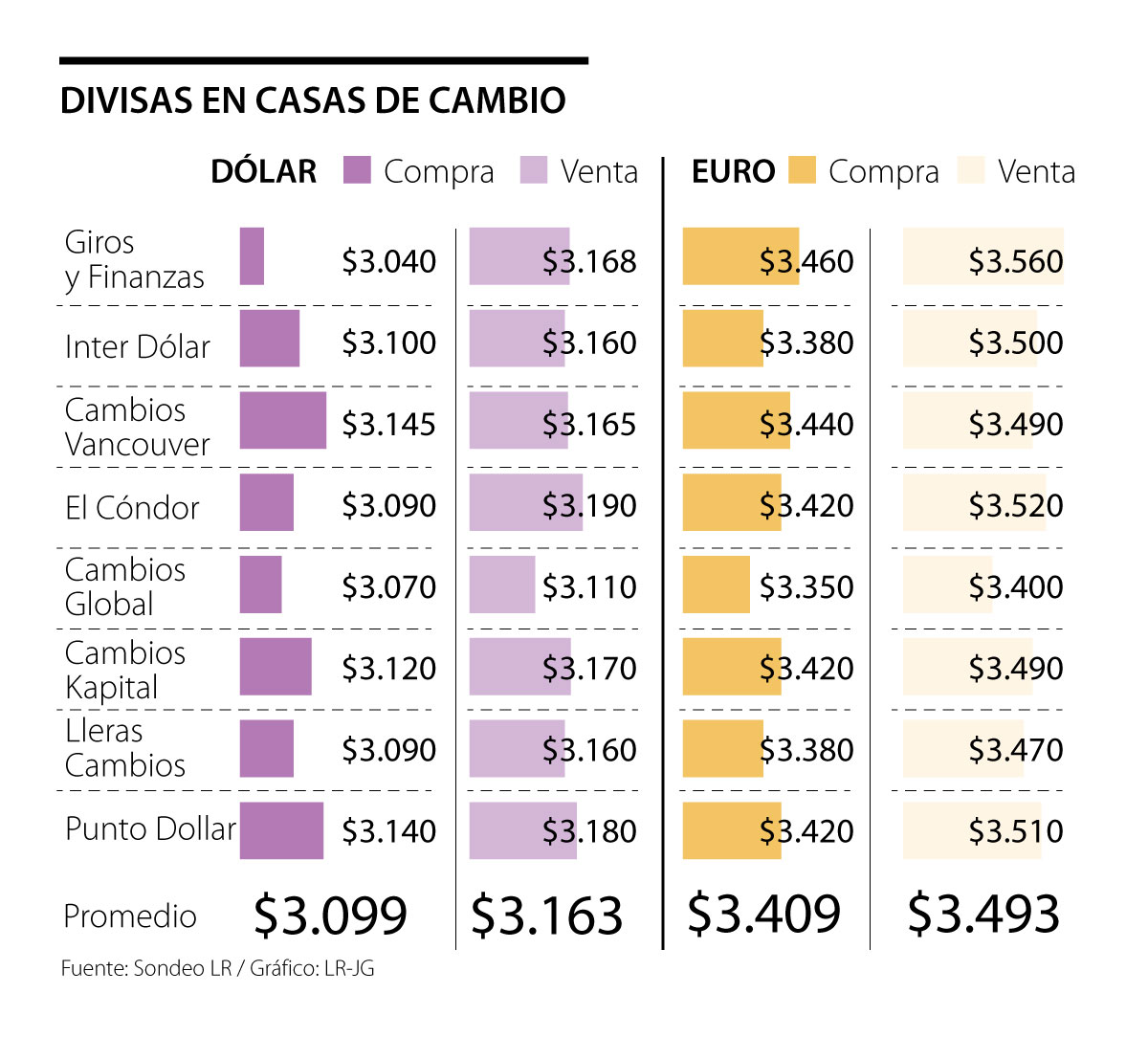 Entre tanto, las casas de cambio ofrecerán $3.409, en promedio, por cada euro que se les venda, y será Giros y Finanzas la que pague más.
