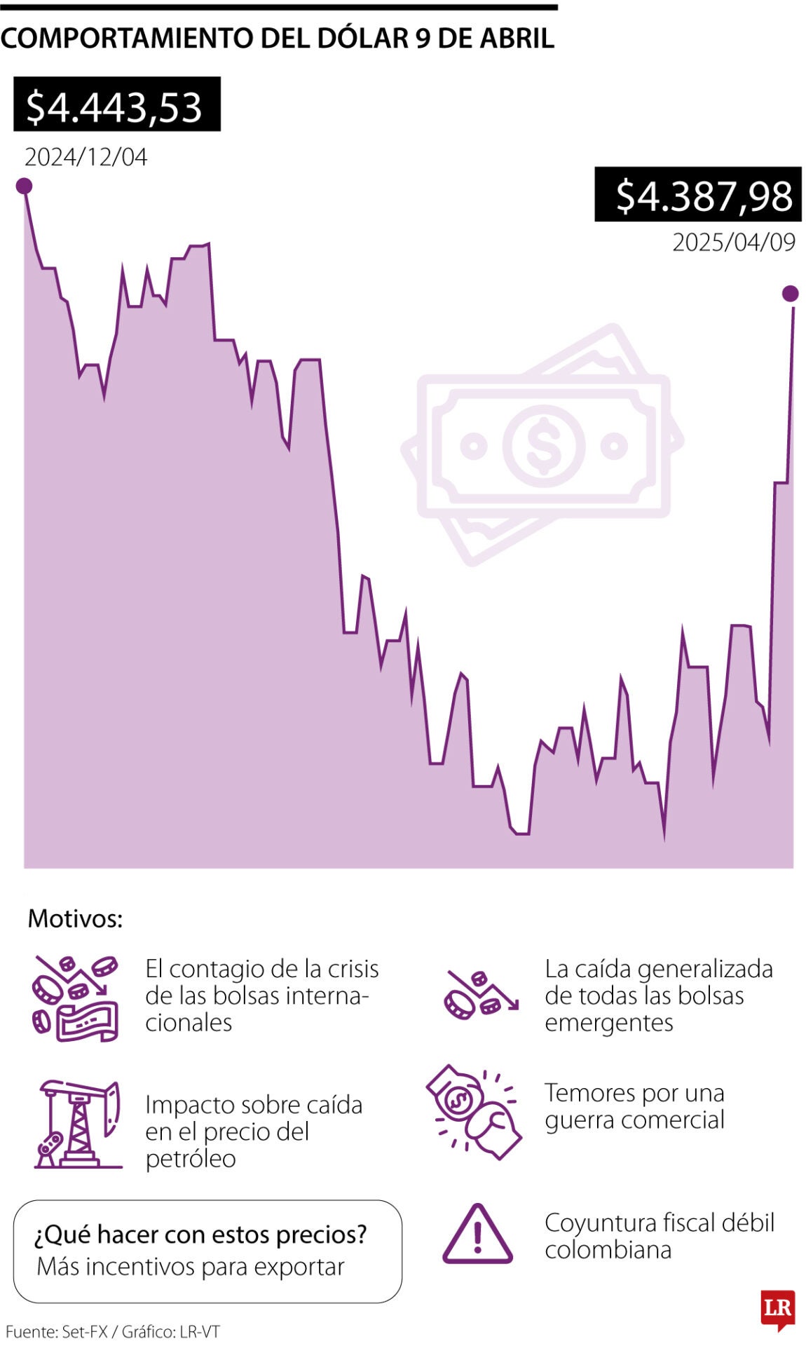 La guerra comercial que empezó Trump generó incertidumbre dentro de los mercados, con caída en las bolsas por cinco días, lo que afectó a las monedas emergentes, como el peso colombiano, ya que los inversionistas se refugian en activos “fuertes” como lo es el dólar frente a la divisa nacional.