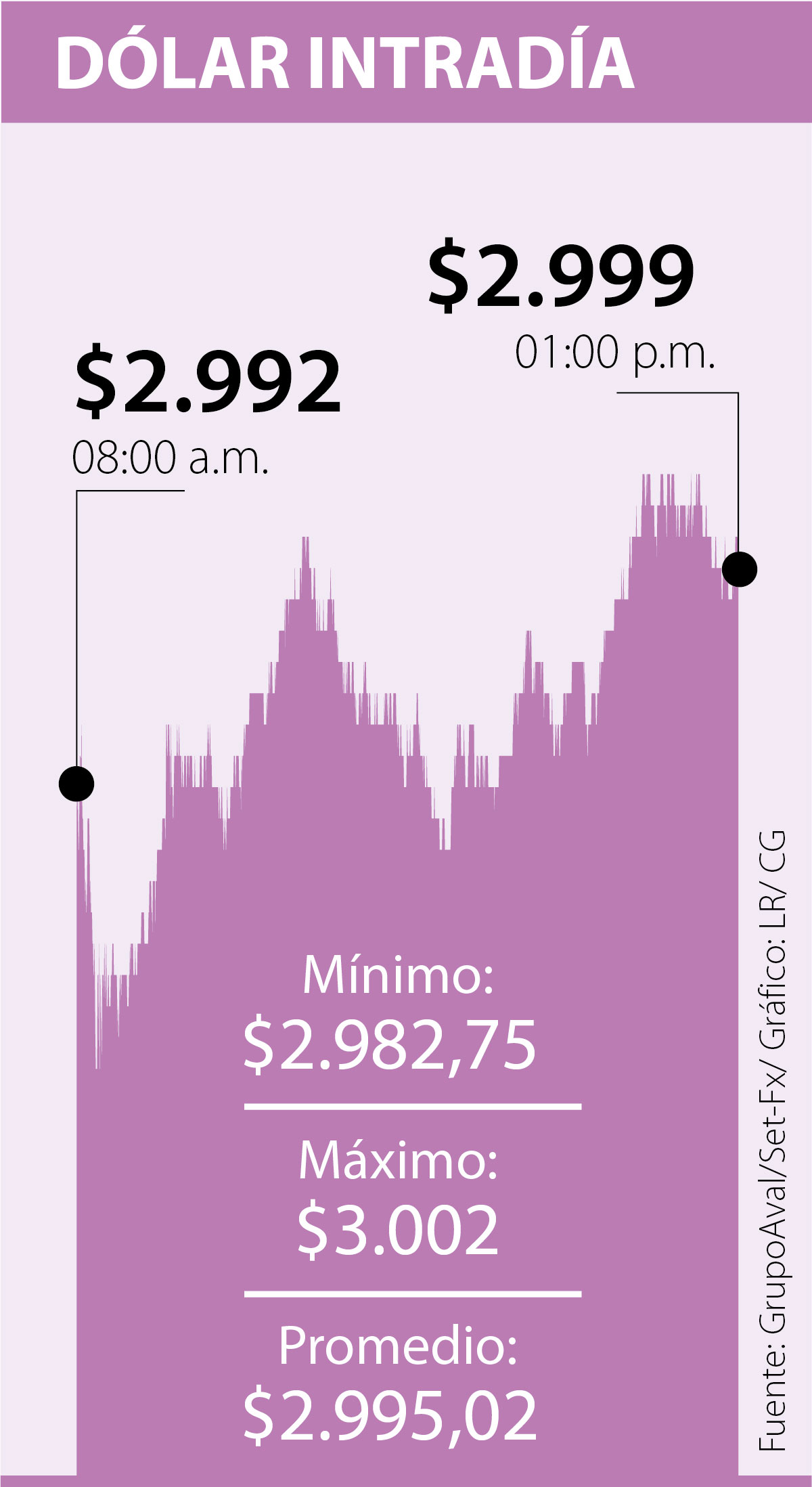 De acuerdo con la plataforma Set-Fx, la moneda norteamericana abrió la jornada con un descenso de $11,44 a un precio de $2.992. A lo largo del día, el dólar se movió entre mínimos de $2.982,75 y máximos de $3.002 y su cierre se ubicó en $2.999,70. Además, al final del día se negoció un monto total de US$1.157 millones en 1.945 operaciones.