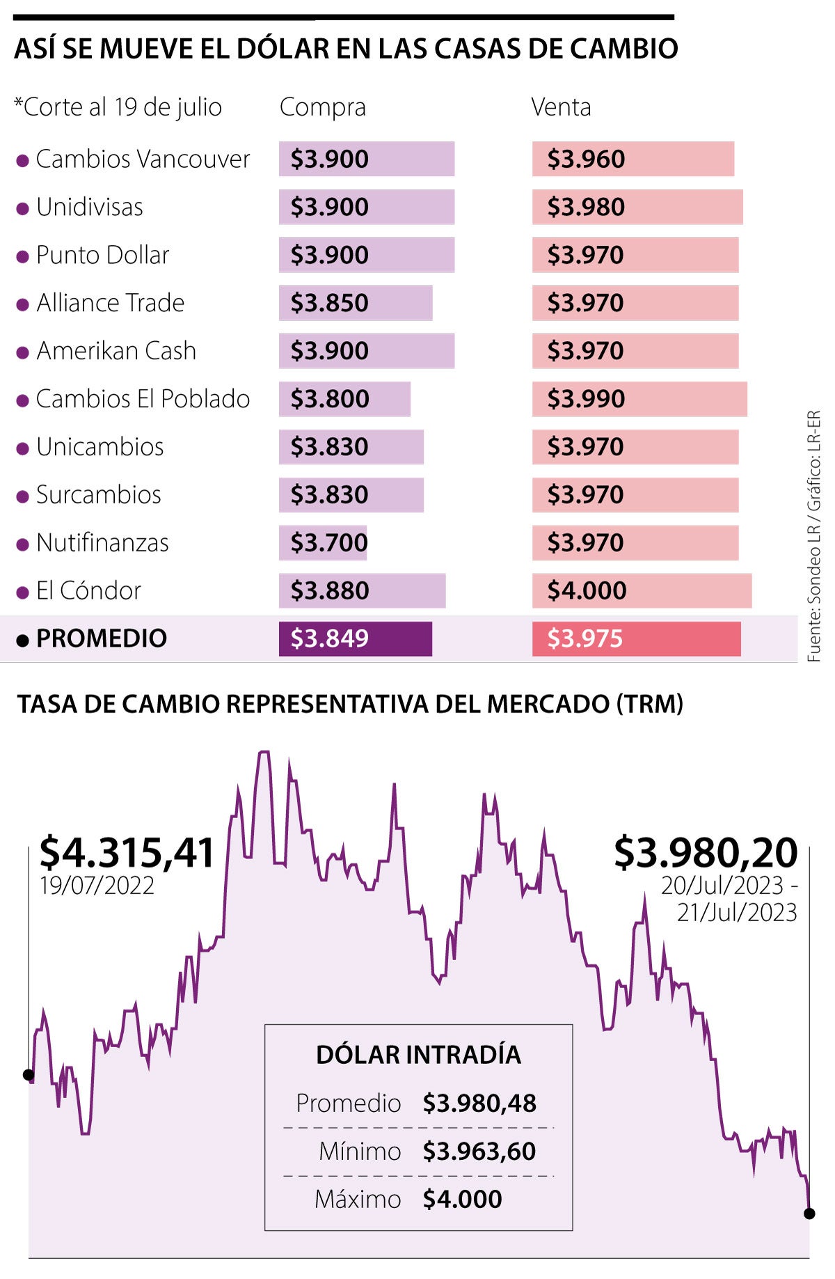El miércoles pasado el dólar en las casas de cambio finalmente volvió a negociarse debajo de los $4.000 por primera vez en más de un año. Solo algunos establecimientos en Medellín lo tienen en este nivel, pero con base en un promedio entre 10 comerciantes minoristas, la moneda se mueve a $3.975.