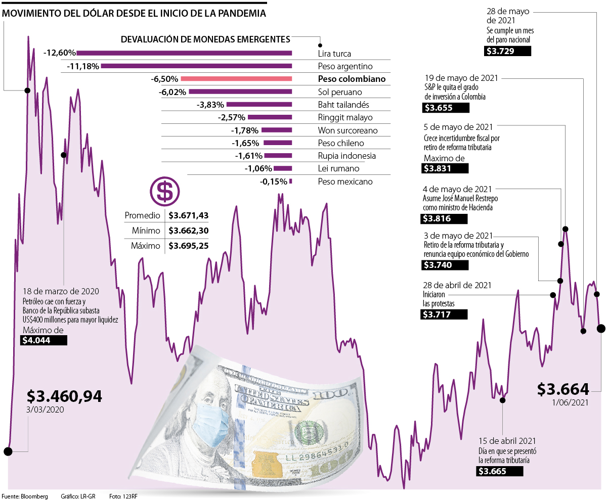 El dólar en el mercado local ha crecido $238,93 en lo que va del año. Solo en mayo bajó $24,86. Desde el inicio de las marchas, el 28 de abril, la divisa ha bajado $46,03. Luego de que Colombia perdiera el grado de inversión de Standard & Poor’s, la moneda ha ganado $5,69, y en los últimos 12 meses ha perdido $47,39.