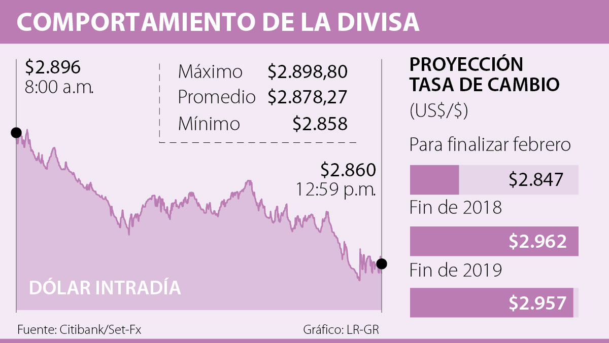 Esta expectativa de baja, a la que se acercó el precio de cierre de la jornada ($2.860), está basada en que la moneda “ha estado presionada a nivel mundial, por el retroceso del miedo que se dio en los mercados a inicios de febrero por fuerte volatilidad”, explicó Juan Carlos Cendales, analista de divisas de Credicorp Capital, quien agregó que otro factor que ha influido en la baja es el alza del precio de los activos que cotizan contra el dólar, como el petróleo.