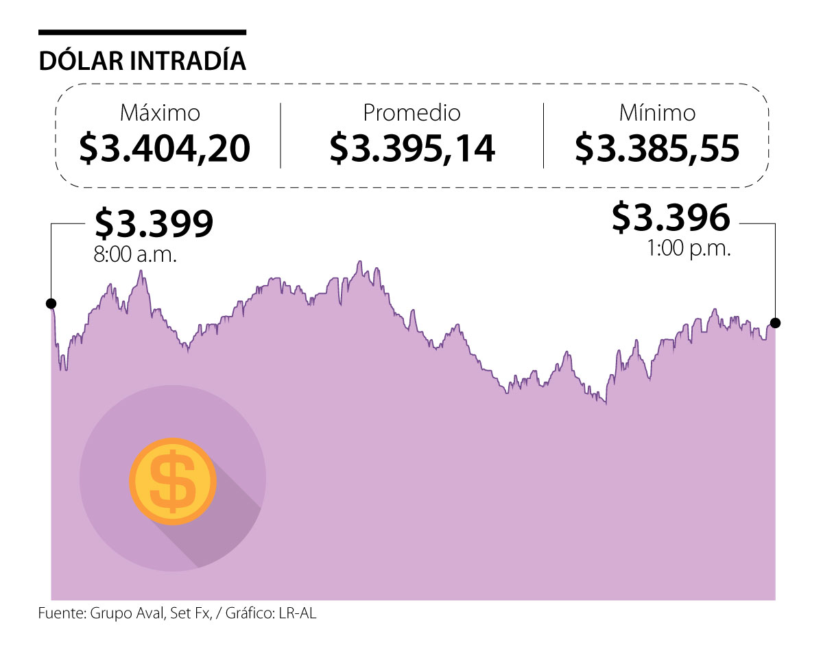 El viernes, el dólar alcanzó un precio promedio de $3.395,14, lo que representó un alza de $7,42 frente a la Tasa Representativa del Mercado (TRM), que ese día se ubicó en $3.387,72.