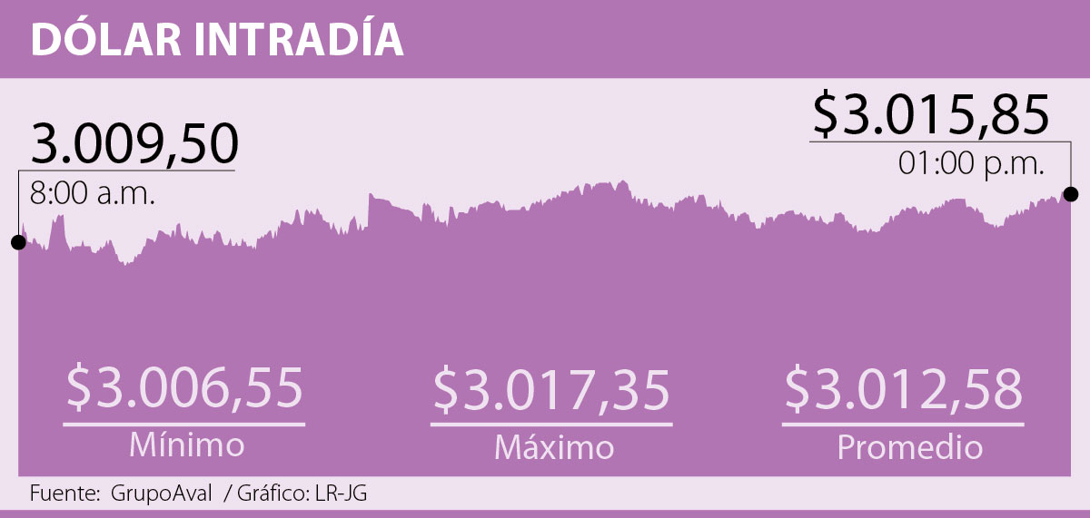 Siguiendo con la tendencia alcista que ha caracterizado el comportamiento de la moneda estadounidense, en la jornada de ayer la moneda alcanzó un precio promedio de $3.012,58 lo que representó un alza de $7,08 frente a la Tasa Representativa del Mercado (TRM) que se ubicó en $3.005,5.