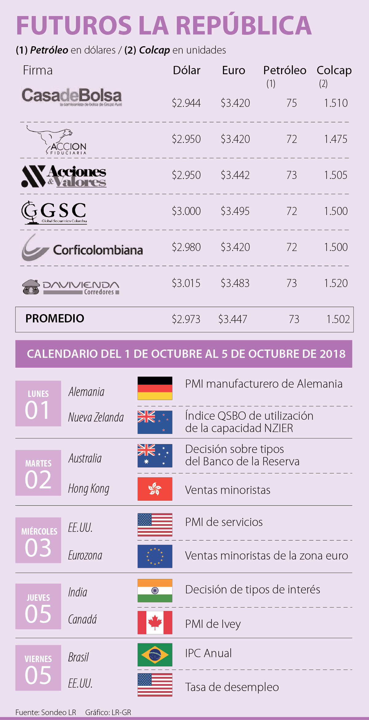 Según Natalia Granados, analista senior de Global Securities, la semana pasada la volatilidad de los mercados fue la protagonista, lo que “hizo que el dólar permaneciera relativamente débil, sin embargo, esto no se vio reflejado en el peso colombiano el cual se mantuvo sobre la barrera de los $3.000; situación que esta semana cambiará. En cuanto al petróleo tuvo una de las mayores valorizaciones semanales sobrepasando los US$71 el barril para el WTI y acercándose al reciente máximo en US$72”.
