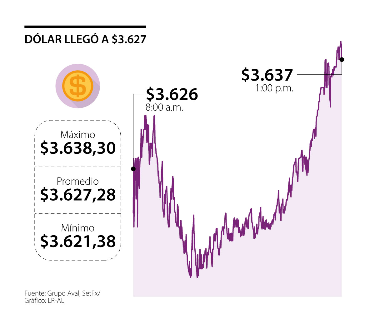 El miércoles, el dólar alcanzó un precio promedio de $3.627,28, lo que representó una caída de $0,92 frente a la tasa representativa del mercado (TRM), que se ubicó en $3.628,20.