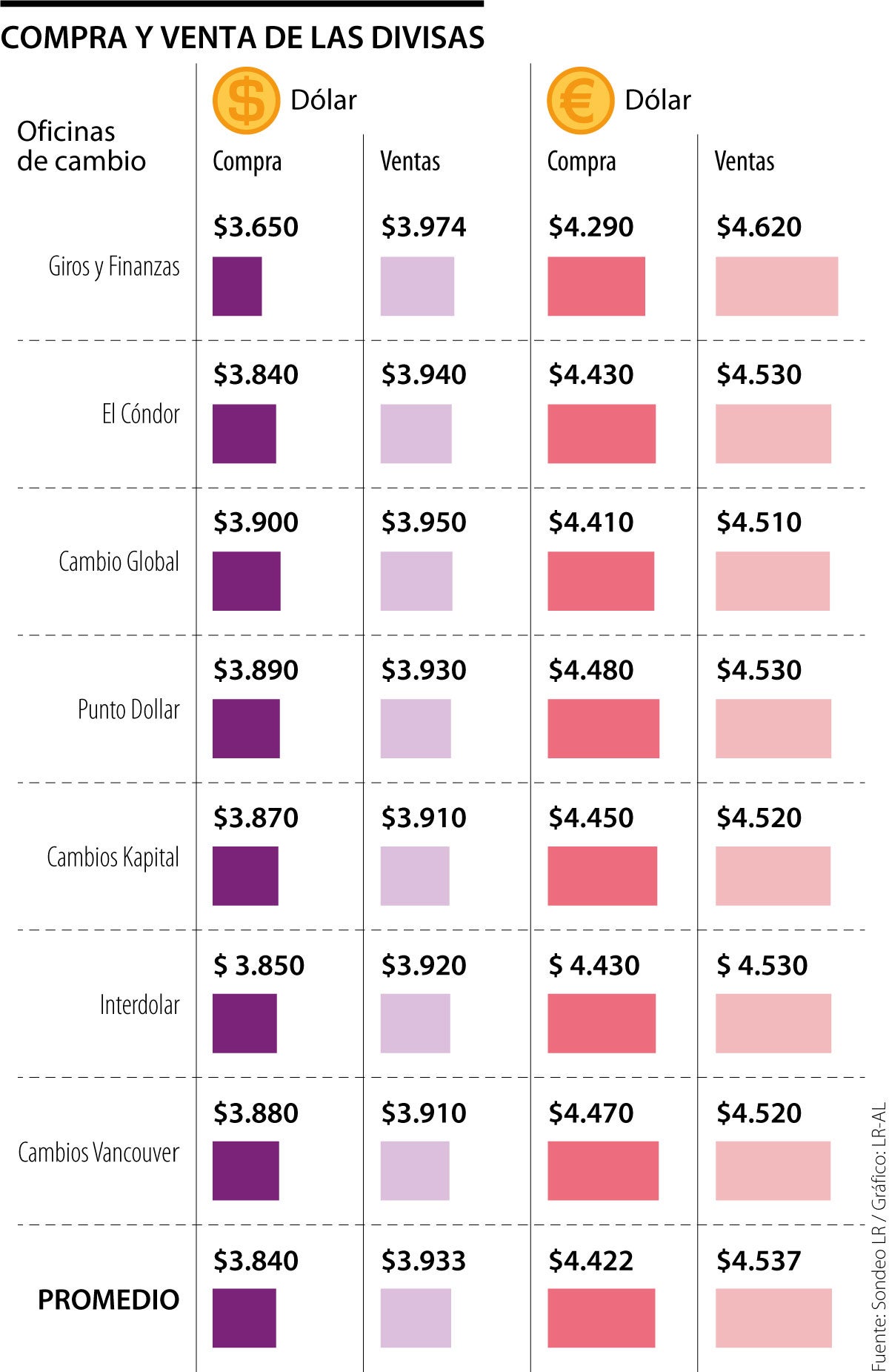 El promedio de compra se ubicó en $3.840, cuyos mejores valores los ofrece Cambios Global ($3.900) y Punto Dollar ($3.890).