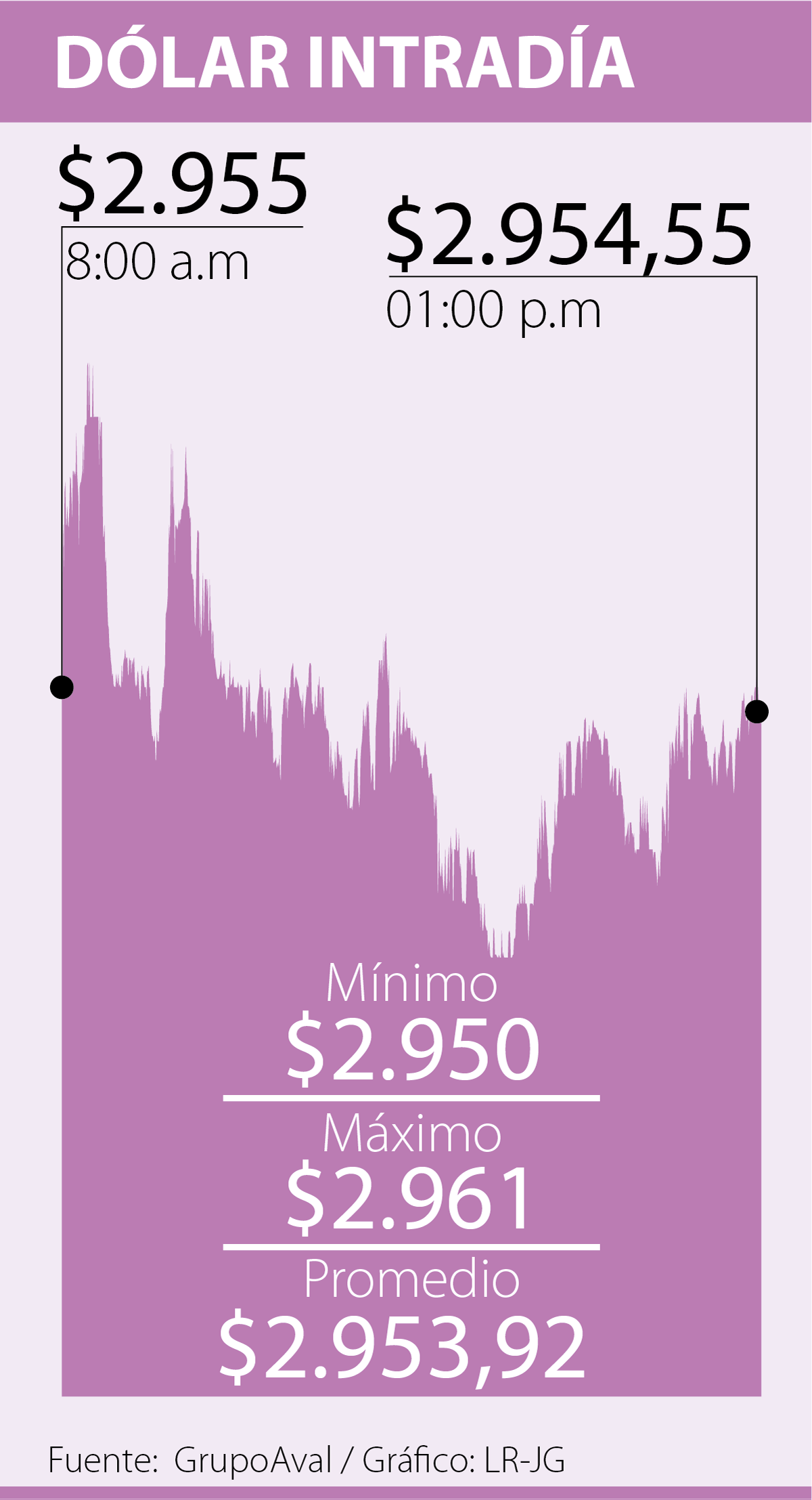 Así, en el cierre de la segunda jornada de negociaciones de la semana, el dólar alcanzó un precio promedio de $2.953,92, lo que representó un alza de $4,59 frente a la Tasa Representativa del Mercado (TRM) que se ubicó en $2.949,33.