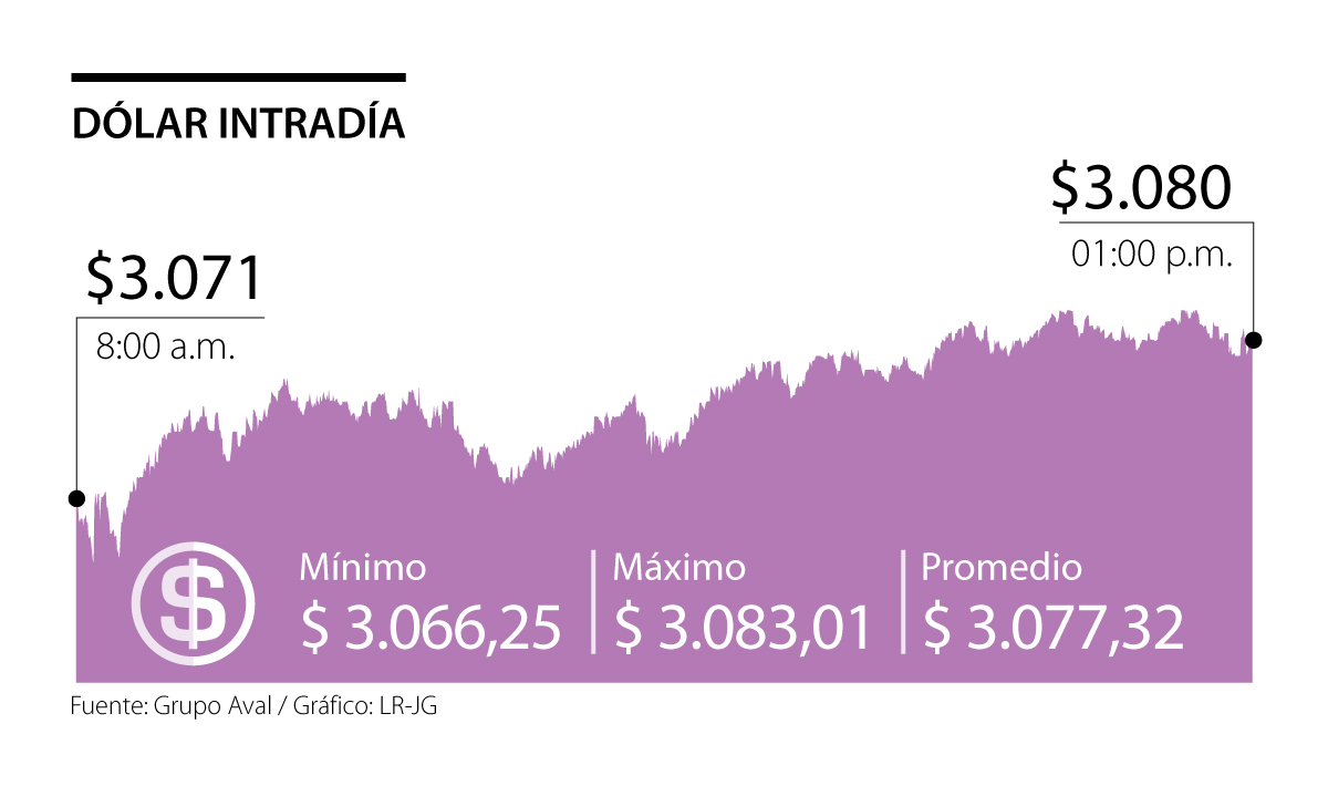 El dólar cerró el jueves con una cotización promedio de $3.077,32, lo que representó una alza de $5,31 frente a la Tasa Representativa del Mercado del día que se ubicó en $3.072,01.