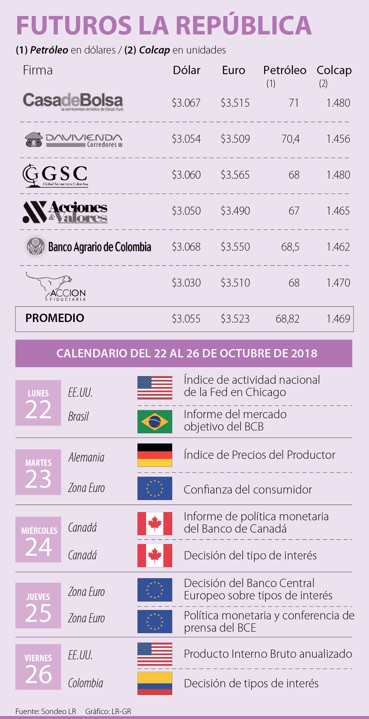 En materia petrolera, los analistas proyectan un WTI a US$68,82 por barril, lejos de la barrera de los US$70. Para Espitia, “los ojos del mercado estarán puestos el 4 de noviembre cuando Estados Unidos inicie con las sanciones a Irán. Este va a ser un evento muy clave para terminar de solucionar la tendencia del petróleo, si será hacia arriba o hacia abajo en lo que resta de 2018”. El analista agregó que el igual el mercado estará atento los inventarios petroleros.