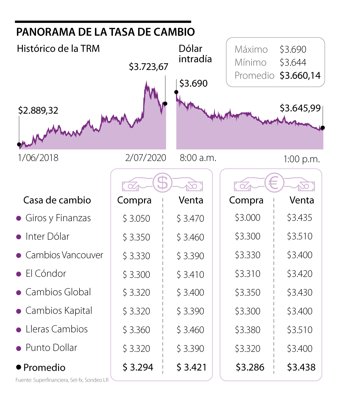LR consultó ocho firmas cambistas de varias ciudades del país y encontró que, en promedio, se puede conseguir la divisa $239 por debajo de la TRM para hoy ($3.660), pues se vende a $3.421 la unidad en promedio.