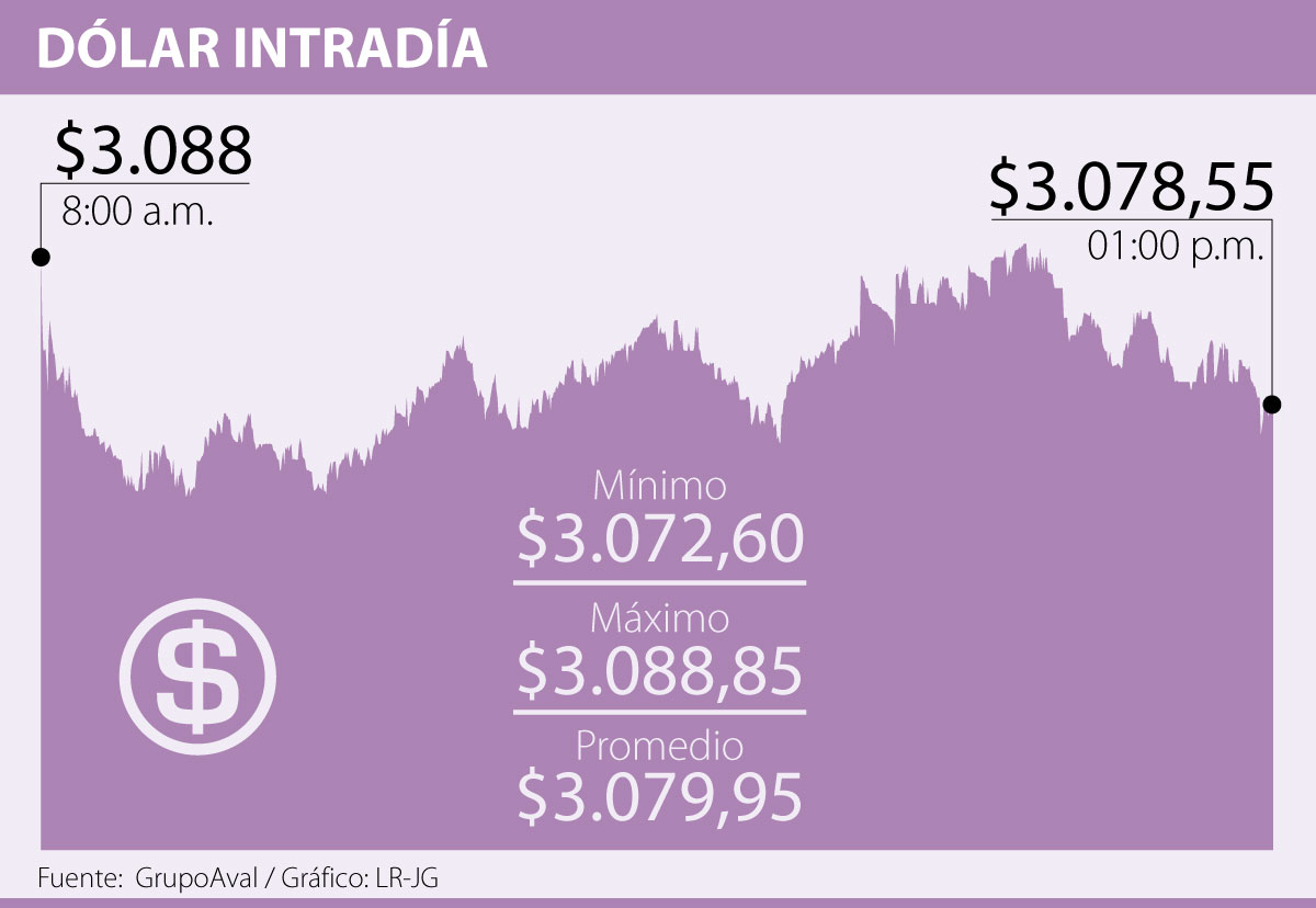 En los dos últimos días el dólar tuvo jornadas de alta volatilidad, el jueves se encontró cerca a tocar los niveles de $3.100 alcanzando a la 1:00 p.m. un promedio de $3.088,48, mientras que ayer la moneda americana al cierre de la jornada, a la 1:00 p.m., bajó y se ubicó con un precio promedio de $3.079,96, lo que representó una caída de $8,51 frente a la Tasa Representativa del Mercado (TRM) que se ubicó en $3.088,47.
