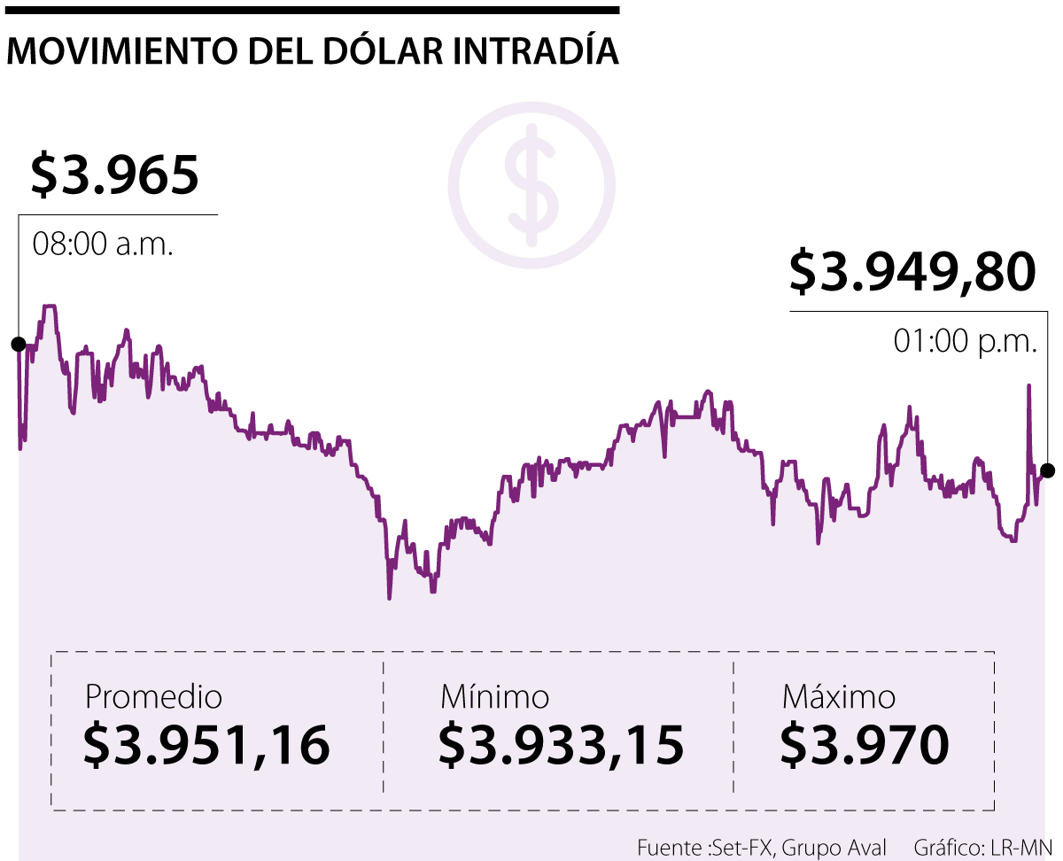Para el cierre de ayer, la moneda se ubicó en $3.951,16, $27,67 abajo de la TRM, de ayer, que estaba en $3.978,83. El mínimo de cotización de la moneda estadounidense fue de $3.933,15, mientras que el máximo mostró picos de hasta $3.970.