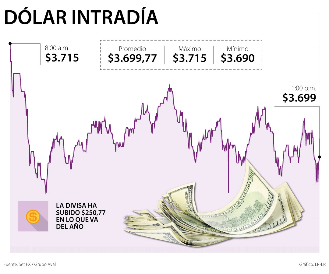 Ayer, el dólar abrió $8,43 por debajo de la Tasa Representativa del Mercado (TRM), que para la jornada se ubicó en $3.717,46. Al concluir la negociación, cerró en $3.699,77, tras caer $17,69 frente a la TRM, una cotización que está, nuevamente, por debajo de $3.700, luego de la escalada por encima de ese nivel que se registró el martes pasado.