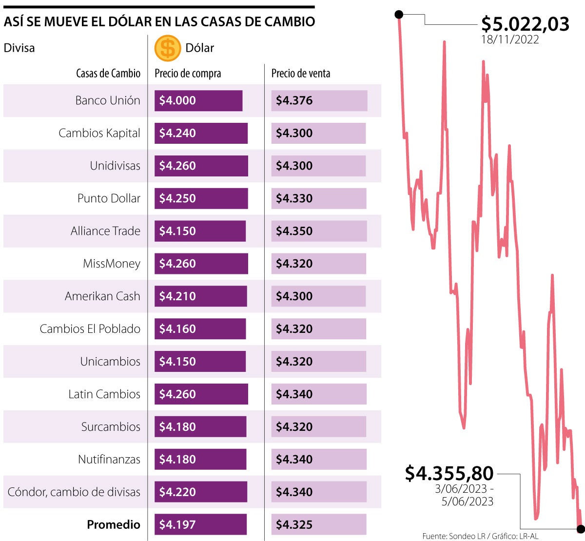 Ahora, las que mejor precio le dan si usted lo quiere vender son Unidivisas, MissMoney y Latin Cambios, a $4.260.