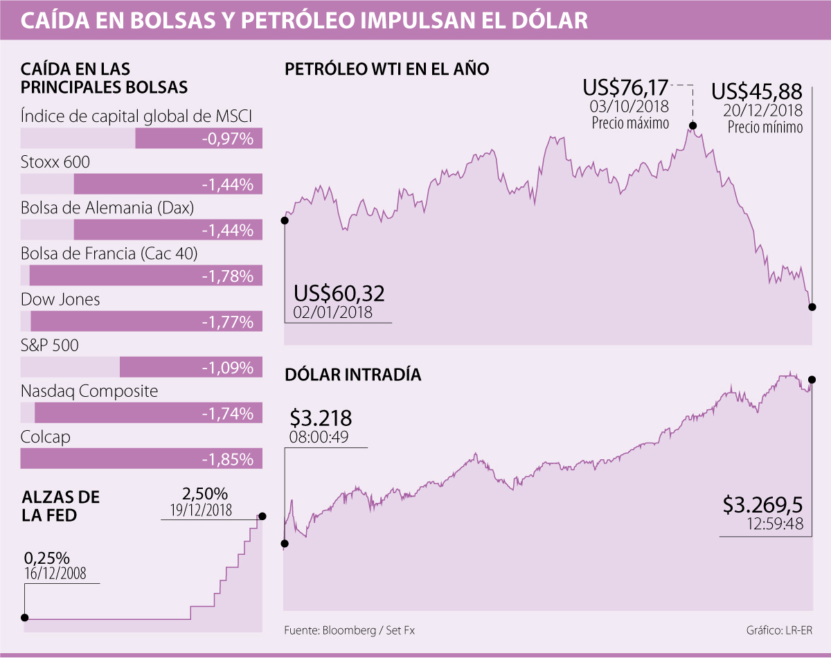 Ahora, los precios del petróleo, que han visto pérdidas de más de 30% desde su pico más alto en octubre, también cayeron presionados por las bajas en bolsas, esto sumado a que se han conocido datos de sobreoferta en EE.UU. y Rusia, dos de los principales productores.