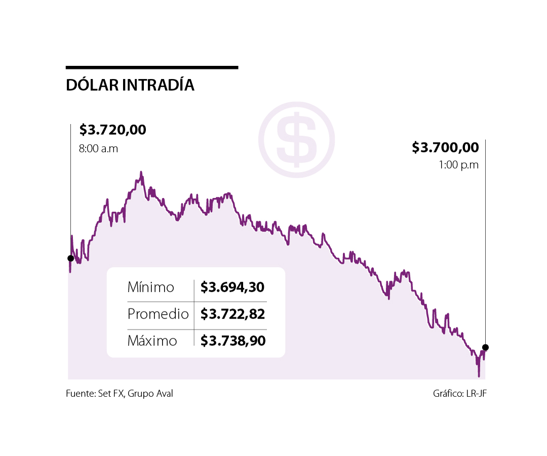 Este jueves, el precio del dólar nuevamente bajó (-$20,97) y se cotizó en un promedio de $3.722,82, cifra con la que alcanzó su valor más bajo desde el pasado nueve de marzo, cuando la Tasa Representativa del Mercado (TRM) se ubicó en $3.584,58.