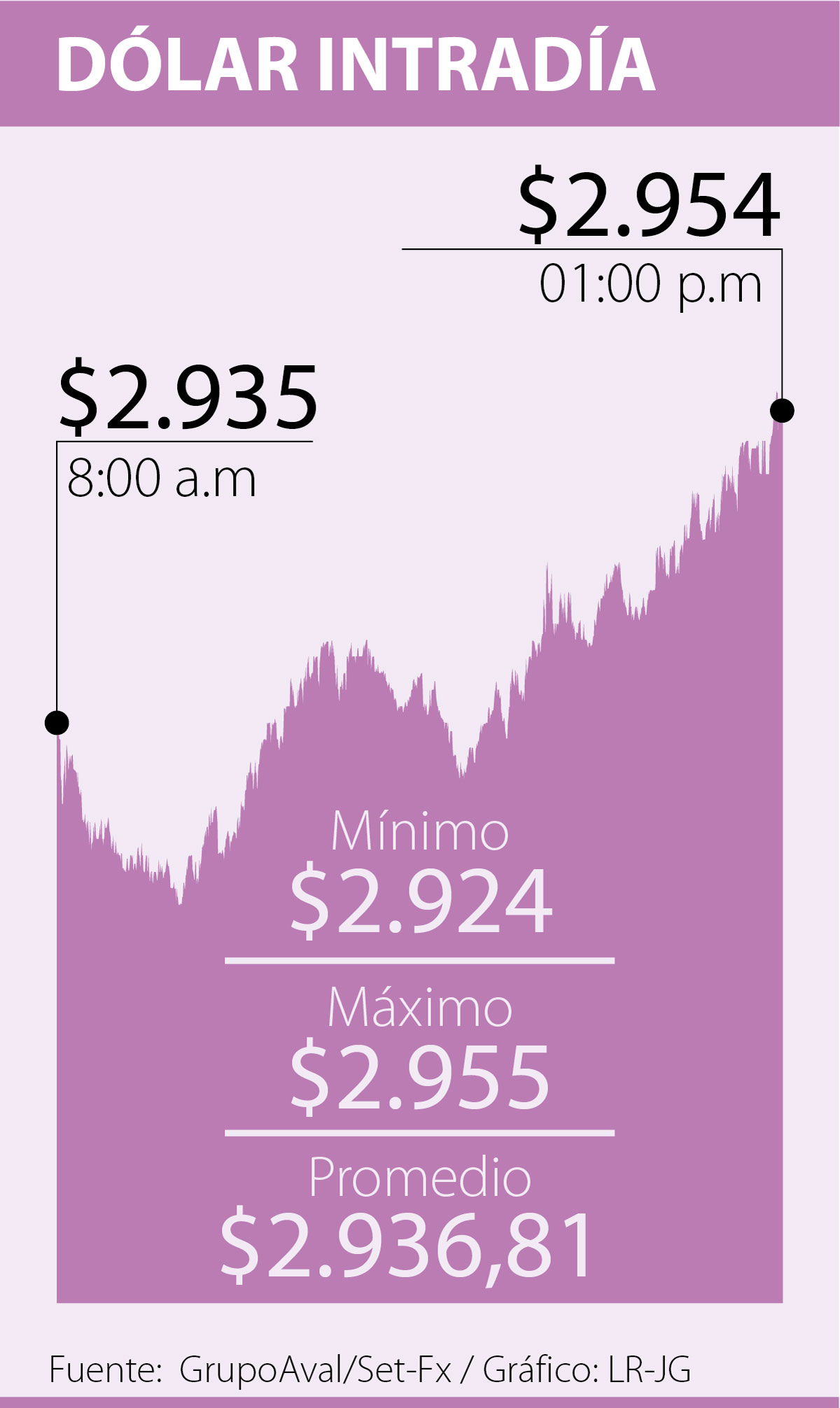 Al iniciar el día, la apertura de la moneda estuvo en $2.935, mientras que su cierre fue por $2.954. El máximo al que llegó fue $2.955, mientras que el mínimo estuvo en $2.924.