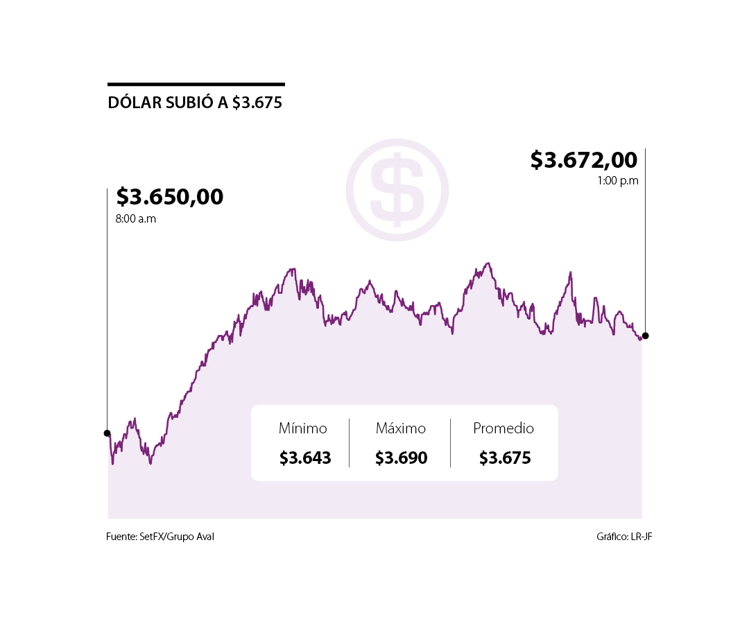 El dólar registró un precio promedio de negociación de $3.675 en la jornada anterior, lo que representó un alza de $31,98 frente a la Tasa Representativa del Mercado (TRM), que se ubicaba en $3.643,02.