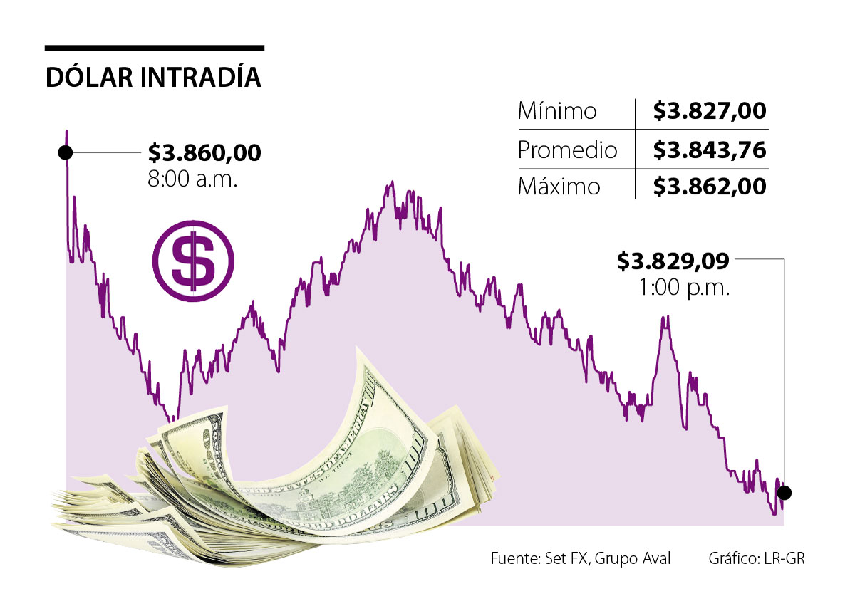 El lunes, el dólar alcanzó un precio promedio de $3.843,76, lo que representó una caída de $38,04 frente a la tasa representativa del mercado (TRM), que se ubicó en $3.881,80.