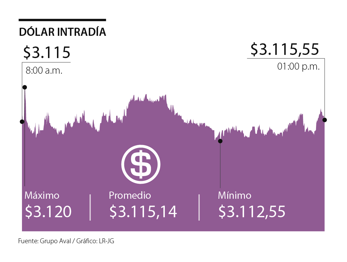 En la primera jornada de la semana el dólar se cotizó en un precio promedio de $3.115,14, lo que representó una caída de $11,1 frente a la Tasa Representativa del Mercado (TRM), que para el lunes fue de $3.126,2.