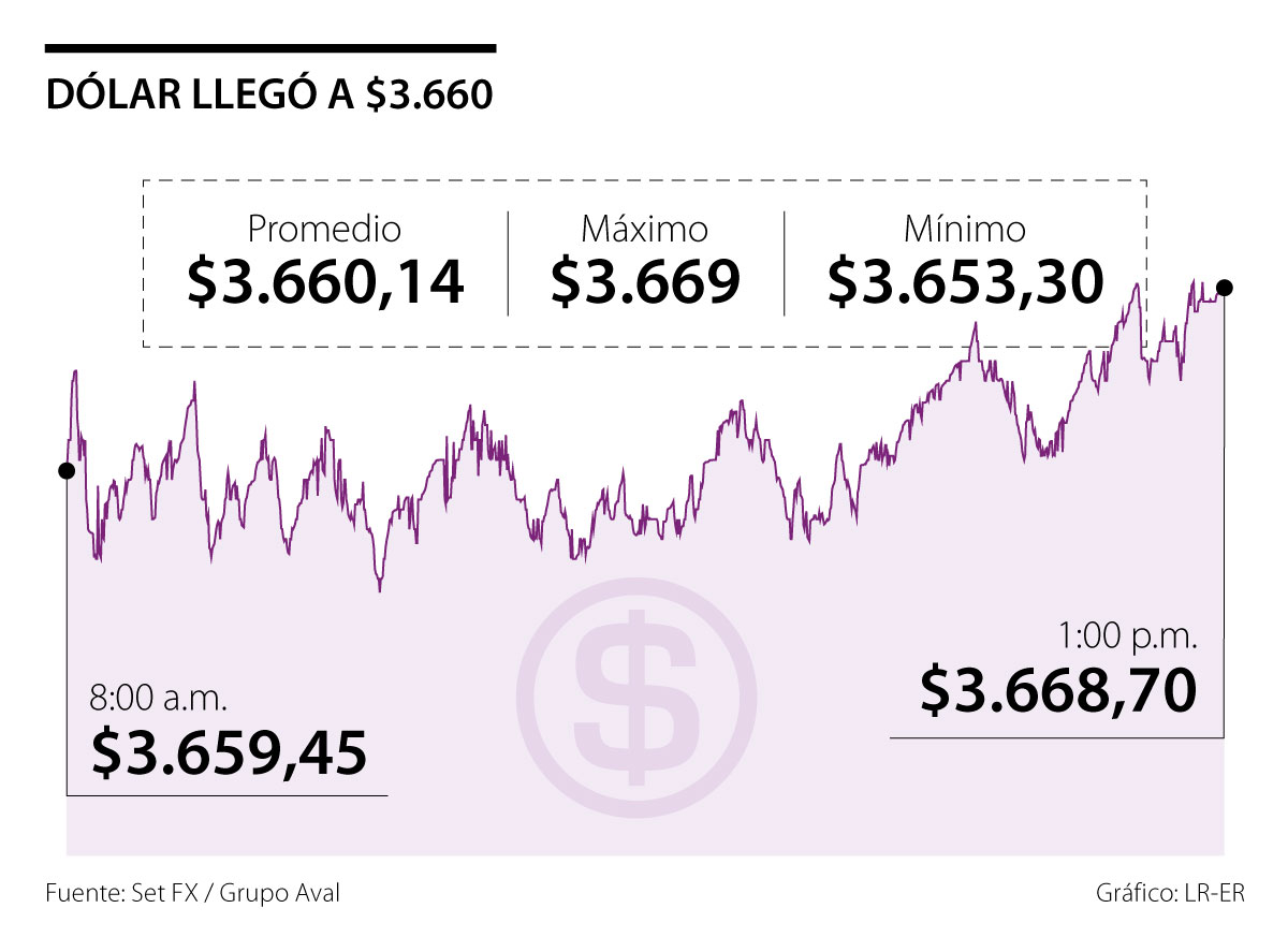 El jueves, la divisa se cotizó a un precio promedio de $3.660,14 y registró un alza de $32,86 frente a la tasa representativa del mercado (TRM), que se ubicó en $3.627,28.