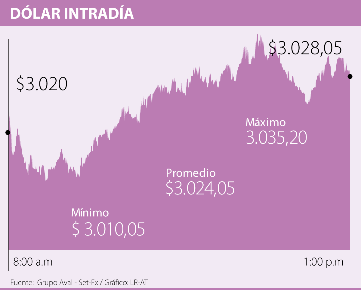 Así, el dólar alcanzó un valor promedio de $3.024,05, lo que representó una subida de $7,8 frente a la Tasa Representativa del Mercado (TRM) que se ubicó en $3.016,7. Cabe mencionar que la divisa abrió la sesión con en $3.020 y su cierre fue de $3.028,05.