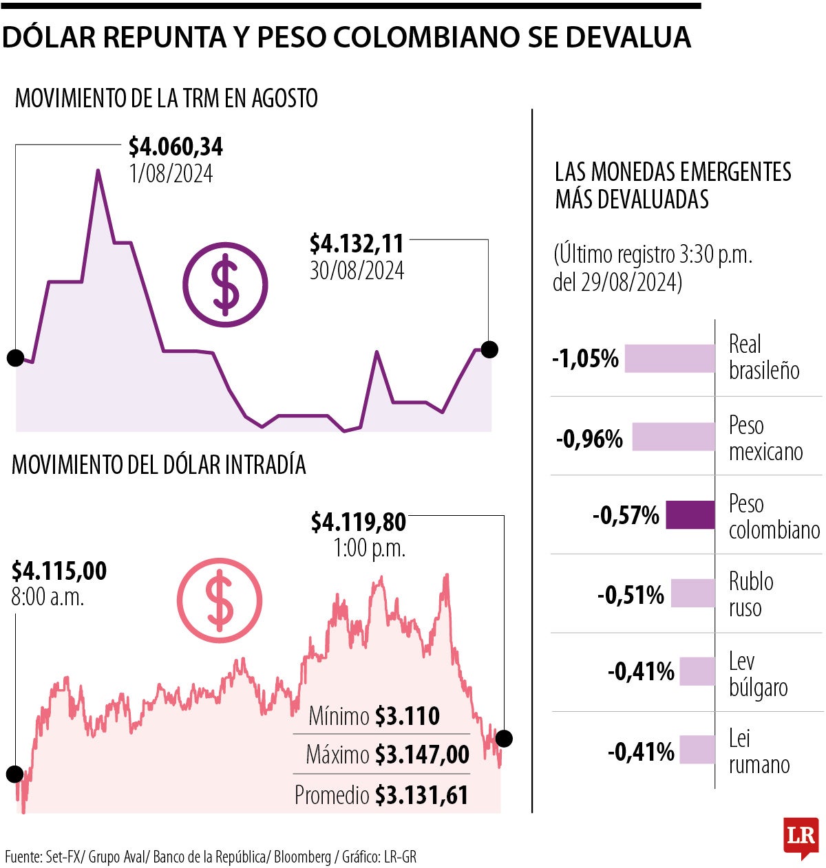 En un comportamiento inversamente proporcional, el peso colombiano se ubicó como la tercera moneda más devaluada con -0,57%, antecedida solamente por el real brasilero (-1,05%) y el peso mexicano (-o,96%).