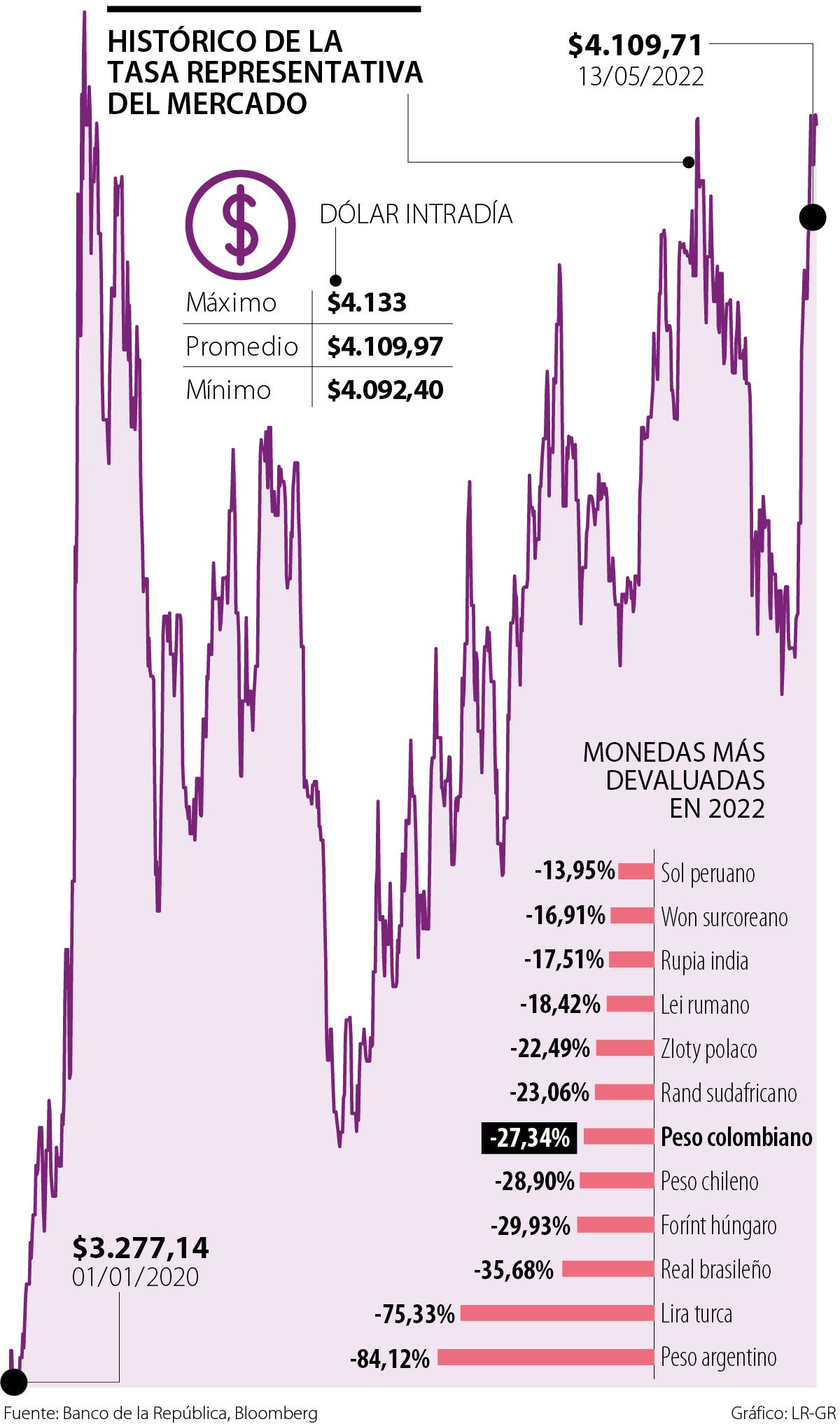 Como consecuencia, la tasa de cambio en Colombia ya superó la barrera de $4.100 y está a menos de $45 de llegar a su máximo histórico de $4.153,91, que se registró el 20 de marzo de 2020, en medio de la pandemia y las restricciones de movilidad.