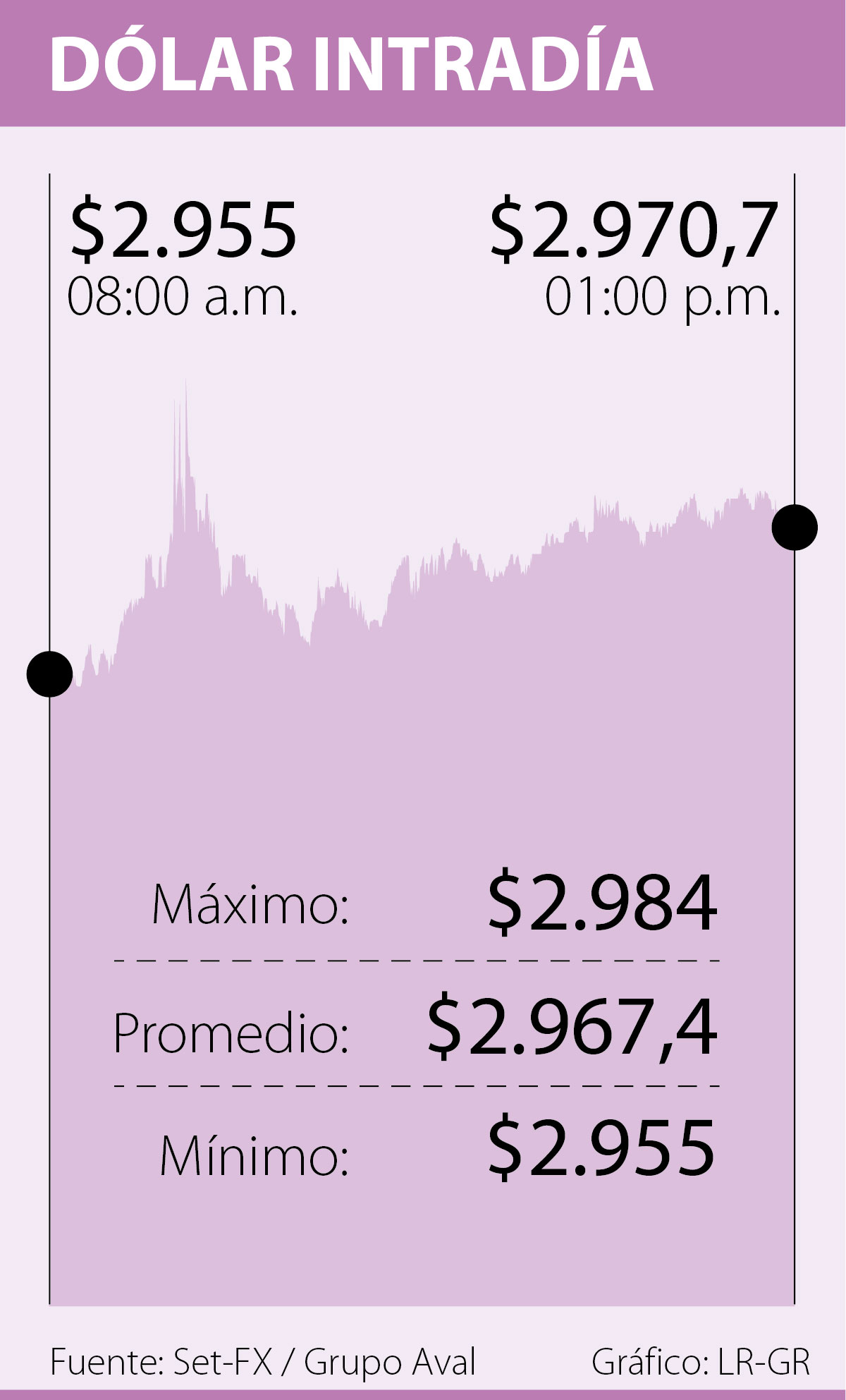 La divisa abrió la jornada con un precio de $2.955 y su cierre estuvo en $2.970,70. El precio mínimo que se registró en la plataforma Set-Fx fue de $2.955, mientras que el máximo estuvo en $2.983,90. El monto negociado durante la jornada era de US$936 millones en 1.493 operaciones.