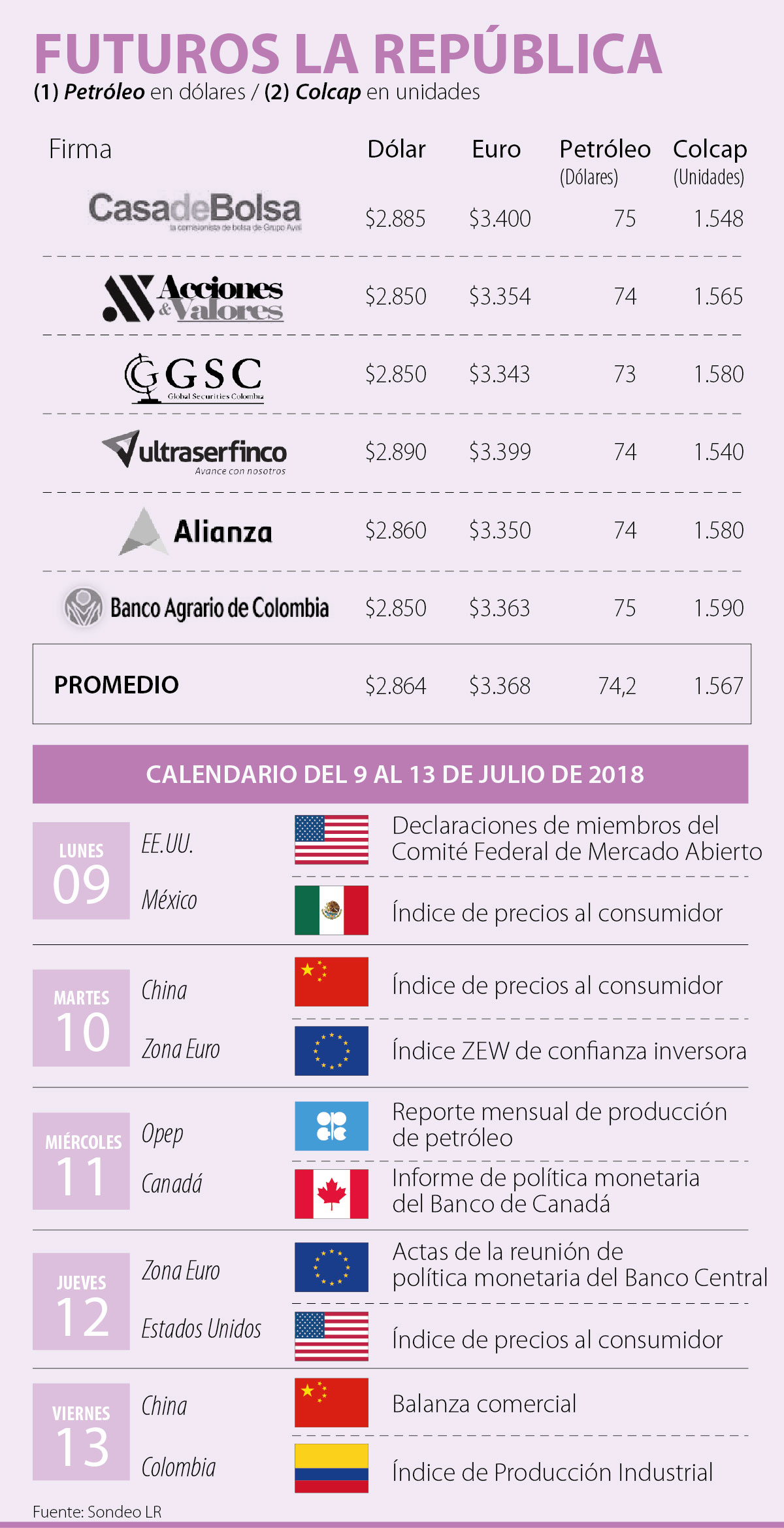 Durante la semana pasada se creó expectativa sobre cómo los mercados iban a recibir la entrada en efecto de los aranceles impuestos a China por Estados Unidos, sin embargo, estos no tuvieron un gran impacto. Wilson Tovar, jefe de investigación de Acciones y Valores señaló que “el mercado no se afectó tanto tras el inicio de los aranceles impuestos a China, por lo que deberíamos volver a tomar mayor correlación con el petróleo con lo que podría bajar más. Pensamos que los fundamentales para Colombia están alineándose en una buena dirección”.