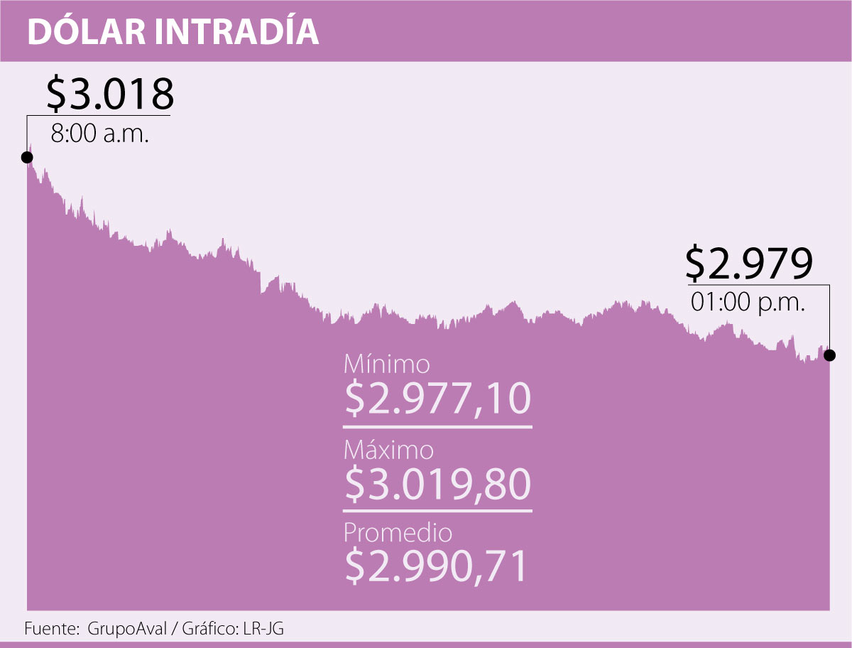 La divisa abrió la jornada con un precio de $3.018, después de que la semana pasada sobrepasara la barrera de los $3.000 que no lograba desde noviembre de 2017; mientras que su precio de cierre se ubicó en $2.979.