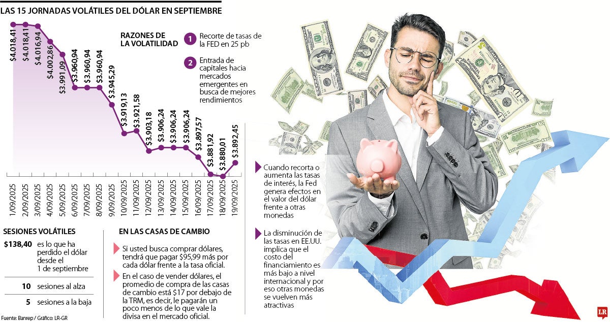 A pesar de que la divisa americana abrió la jornada volátil teniendo múltiples altibajos, no alcanzó el techo de $4.000. El dólar ya completa 15 días con 10 sesiones a la baja y cinco al alza, y precisamente, no se establece sobre los $4.000 desde el pasado cuatro de septiembre, donde llegó a $4.002,86.