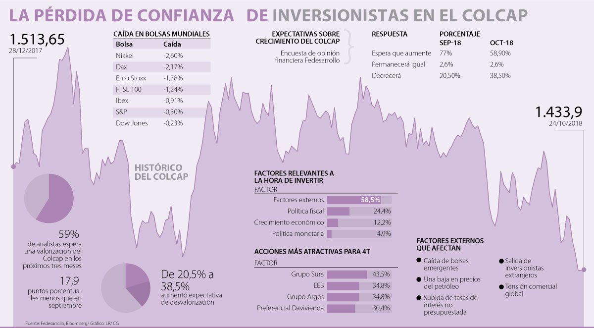Una menor perspectiva de crecimiento para el principal índice de la BVC ha sido impulsada principalmente por factores externos y no por los fundamentales de las empresas que lo componen, de acuerdo con analistas. Entre los factores frente a los que sigue siendo débil el mercado local se encuentran: una mayor caída de las bolsas emergentes, una baja en los precios del petróleo, nuevas alzas de tasas de interés de la Fed no presupuestadas por el mercado y la salida de inversionistas extranjeros en un ambiente de tensión global.