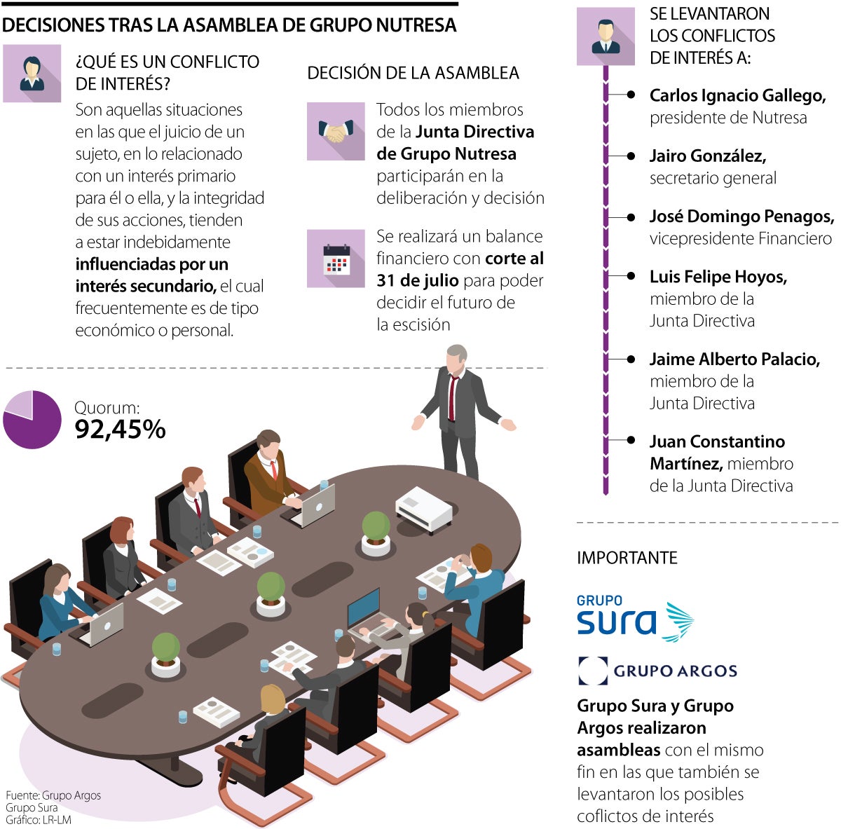 En la asamblea del jueves se autorizóa Carlos Ignacio Gallego, presidente de Nutresa; Jairo González, secretario general; José Domingo Penagos, vicepresidente Financiero; Luis Felipe Hoyos, Jaime Alberto Palacio, y Juan Constantino Martínez, todos miembros de la Junta, para decidir y deliberar en el marco del acuerdo para el desenroque.