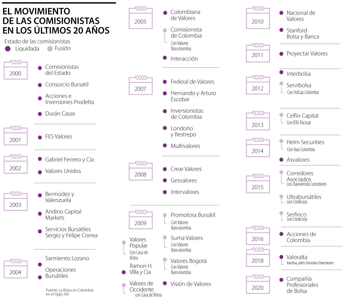 Desde entonces, la gran mayoría de firmas se terminaron fusionando. Servibolsa pasó a ser AdCap Colombia; Cerlfin Capital se fusionó con BTG Pactual; Helm Securities quedó en manos de Itaú Colombia; Asovalores fue liquidada; Corredores Asociados es actualmente Davivienda Corredores; y Ultra Bursátiles y Serfinco fueron adquiridas por Credicorp Capital.