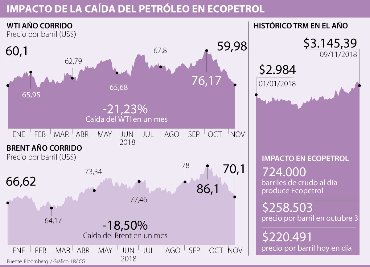 “La caída del petróleo en el mes es bastante importante, no solo para las finanzas del país, que se ven afectadas en el ingreso de dividendos por Ecopetrol, sino en otros factores, ya que mientras el Brent estuvo por encima de US$80, la moneda y el mercado local tuvieron un colchón que los soportaba como los de mejor comportamiento entre los latinoamericanos”, mencionó Diego Velásquez, analista económico de Casa de Bolsa.